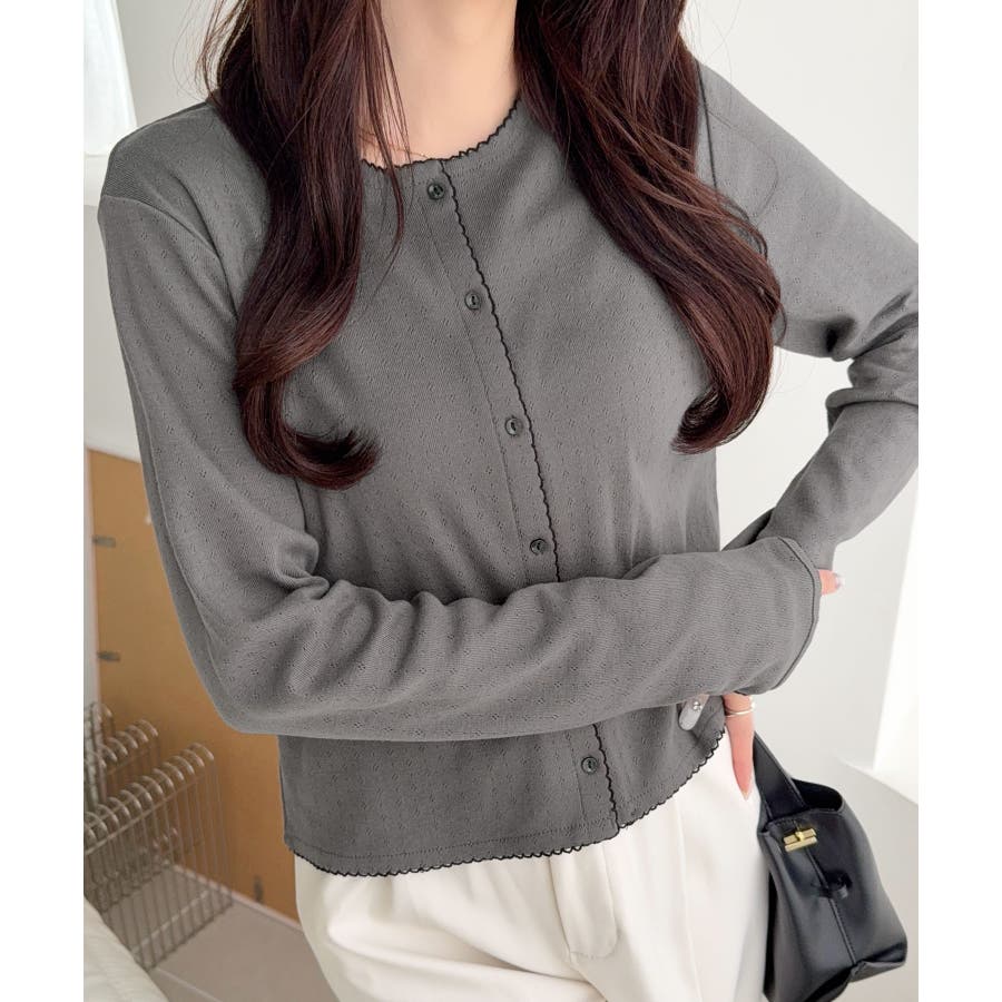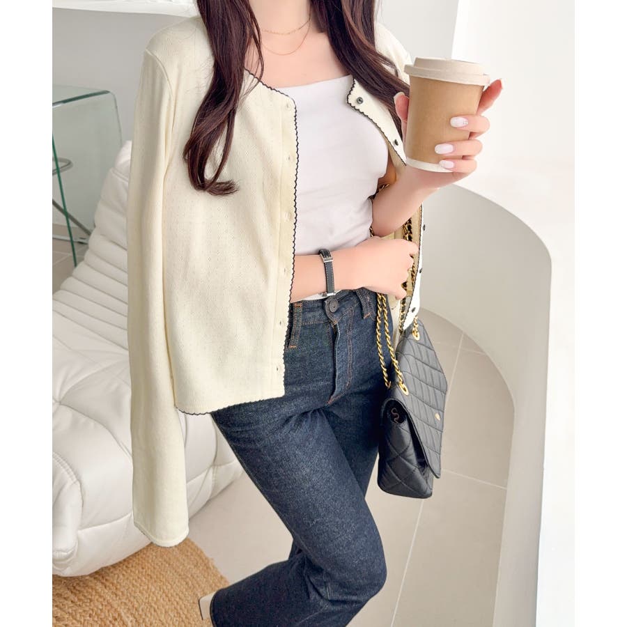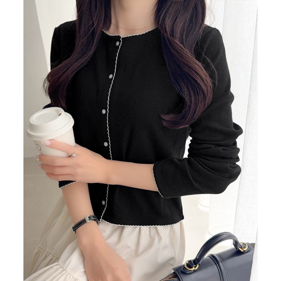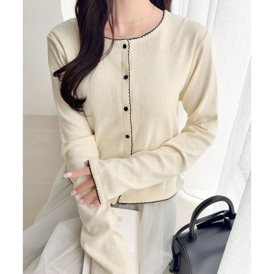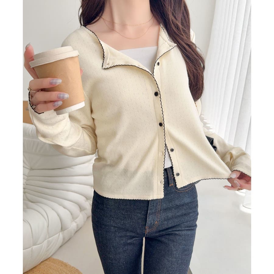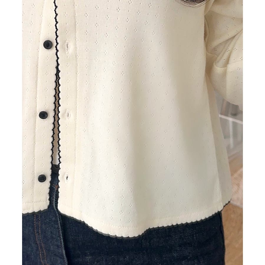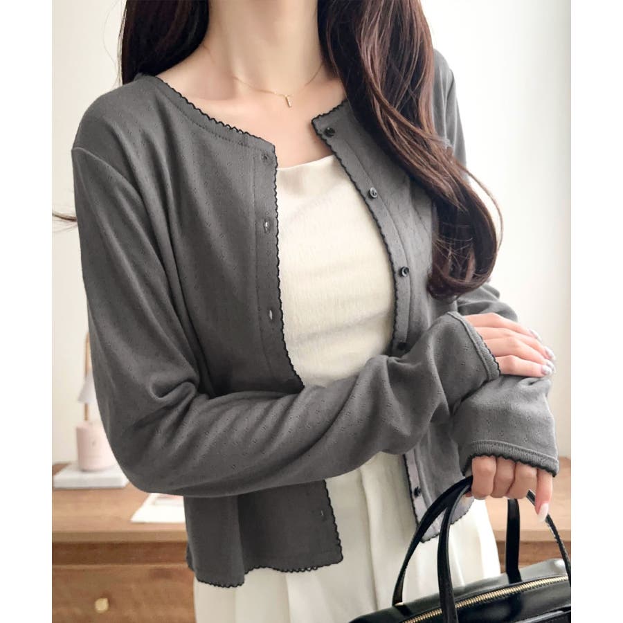 配色スカラップ刺繍とシェル調釦がアクセントとなり、ガーリーからカジュアルまで幅広い着こなしに対応します♪