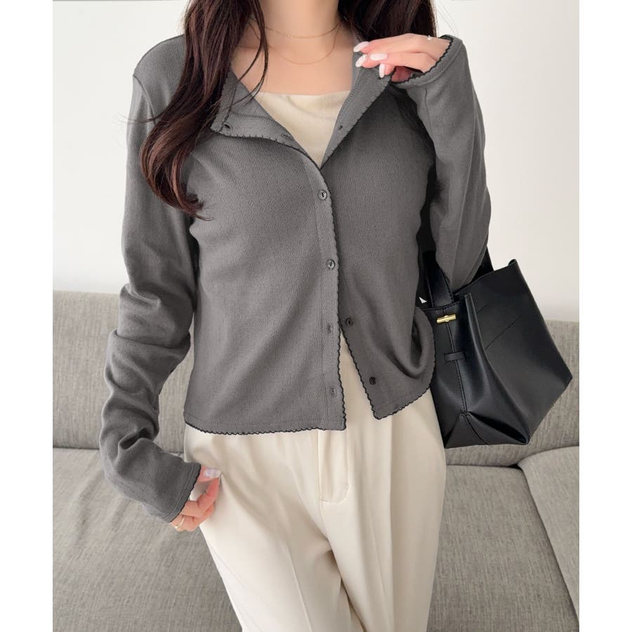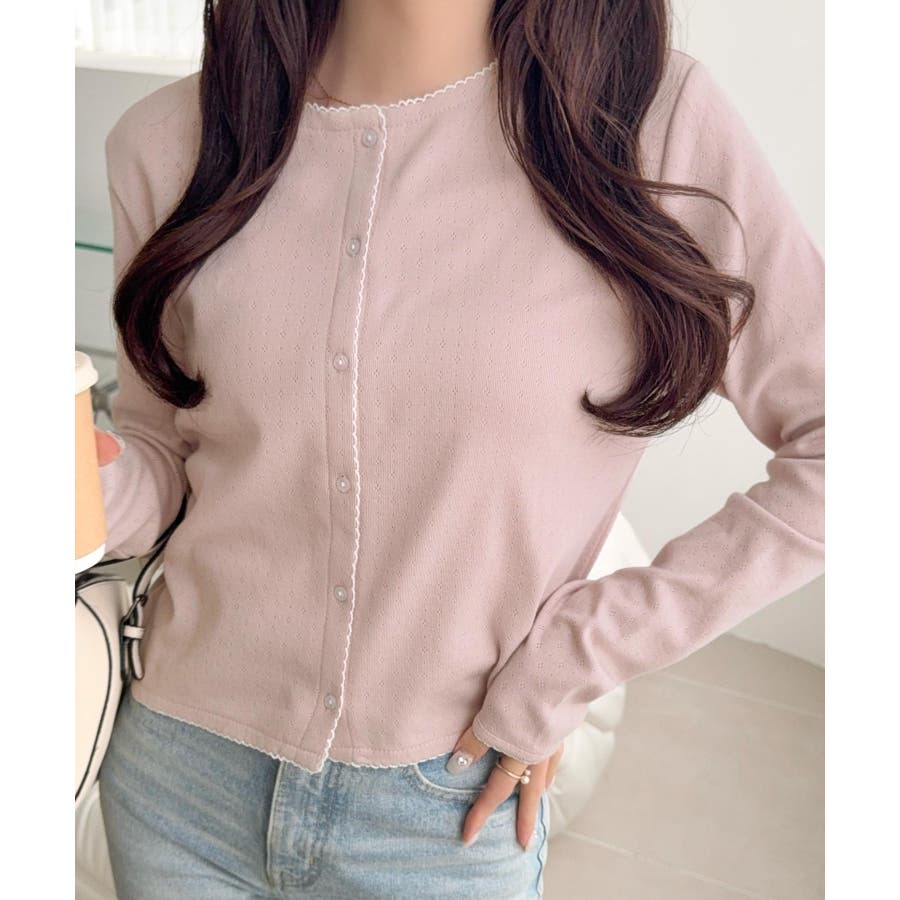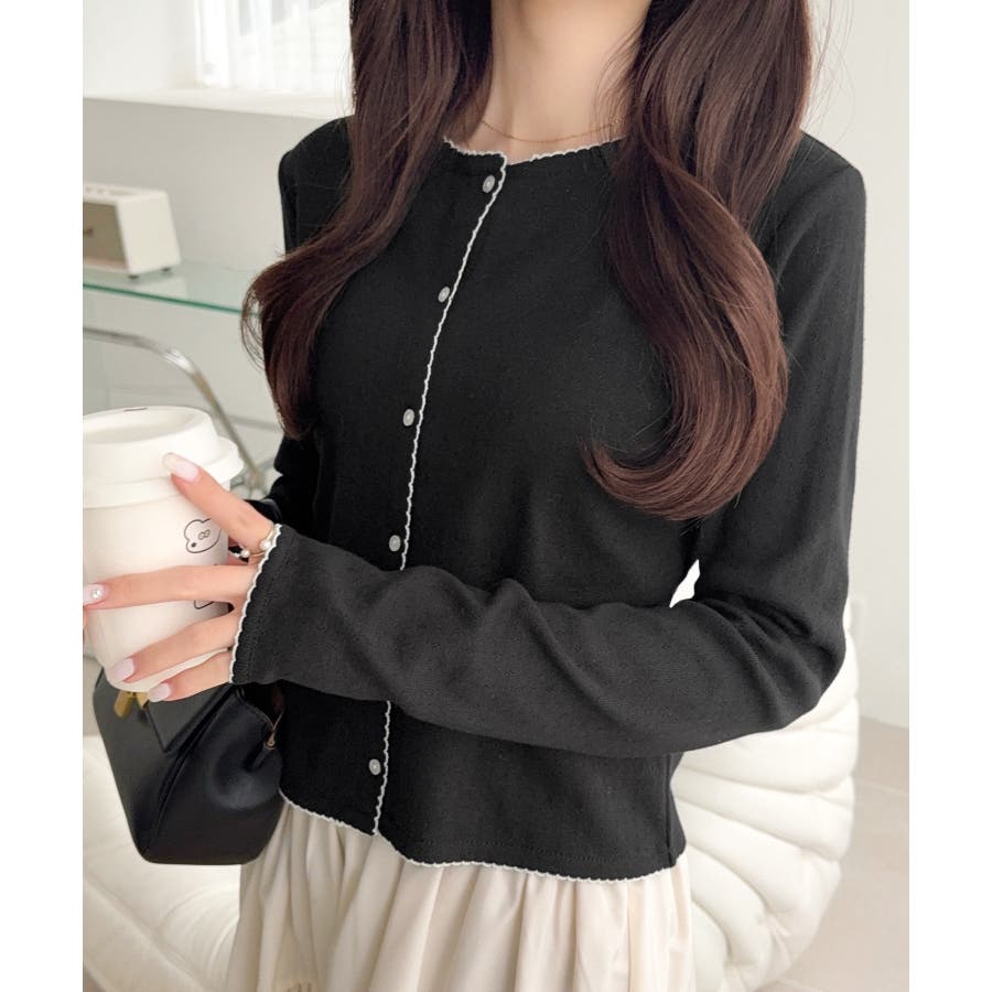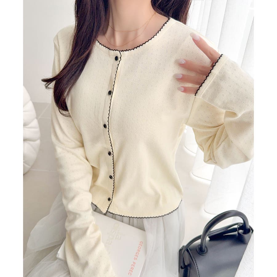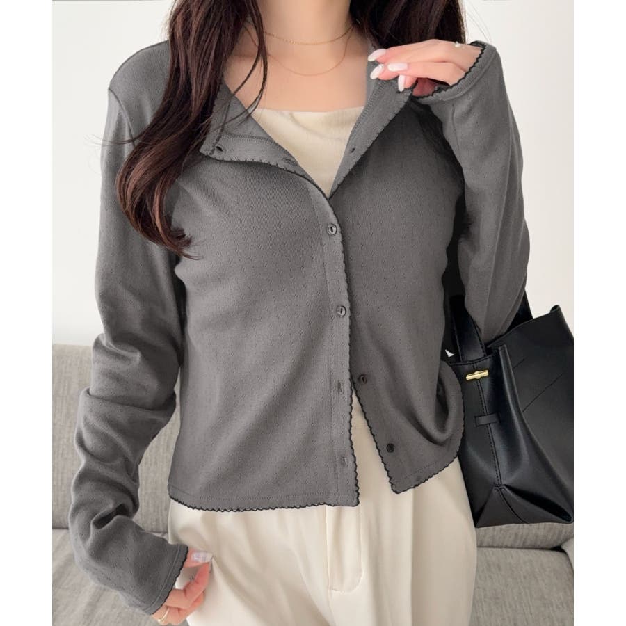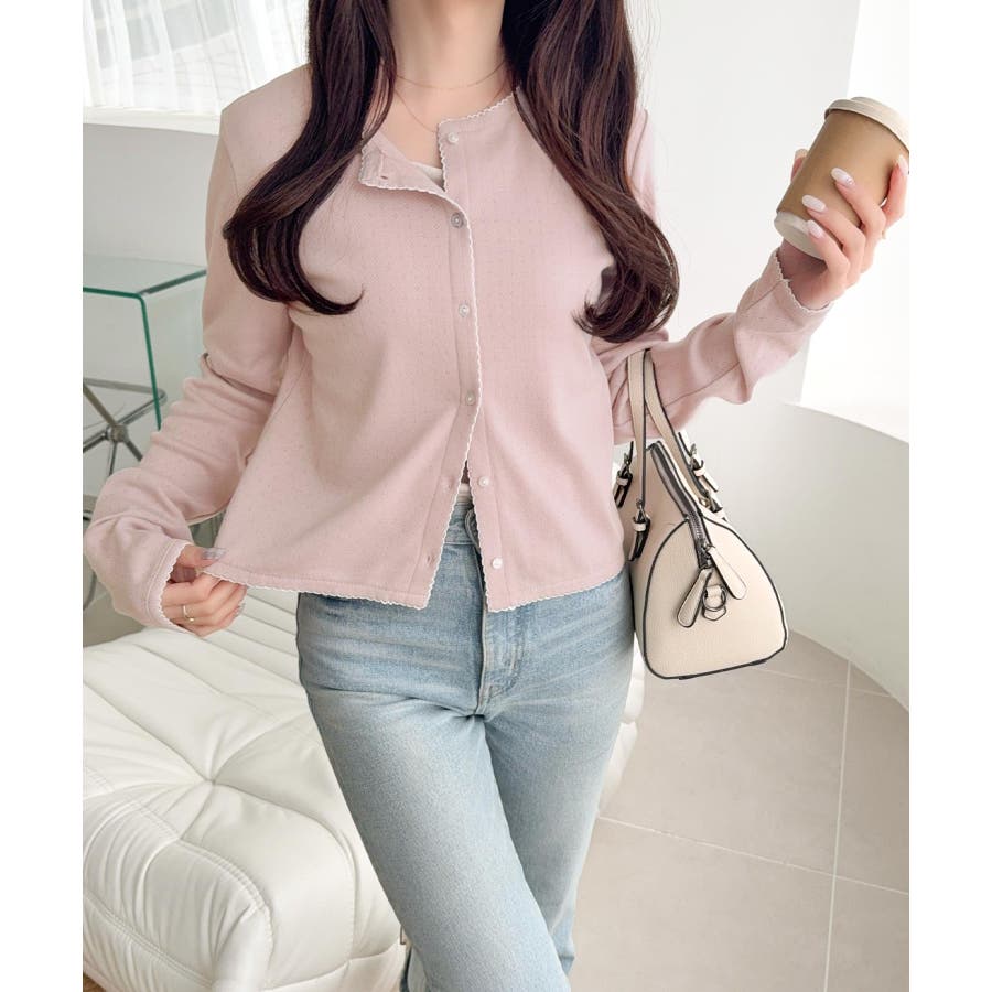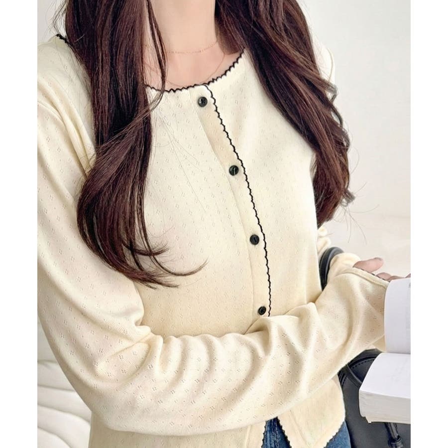 配色スカラップ刺繍とシェル調釦がアクセントとなり、ガーリーからカジュアルまで幅広い着こなしに対応します♪