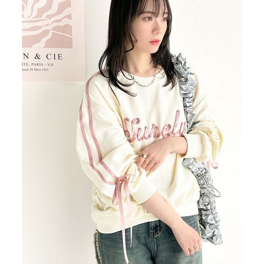 ガーリーテイストなサテンリボンのロゴがアクセント。