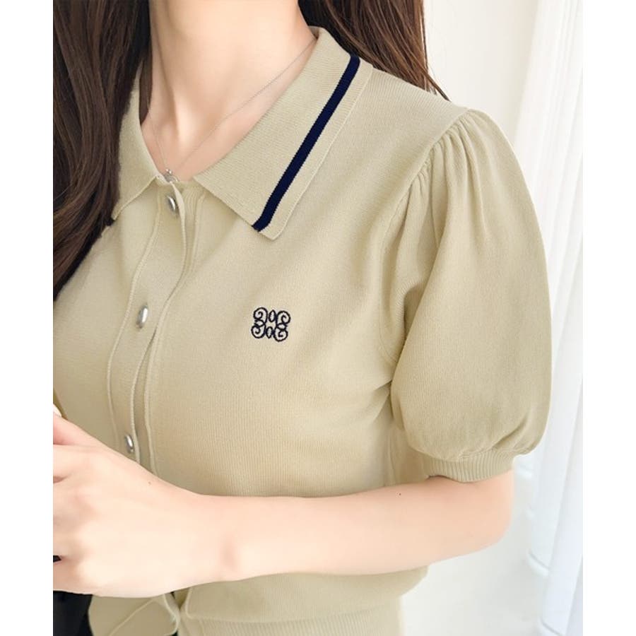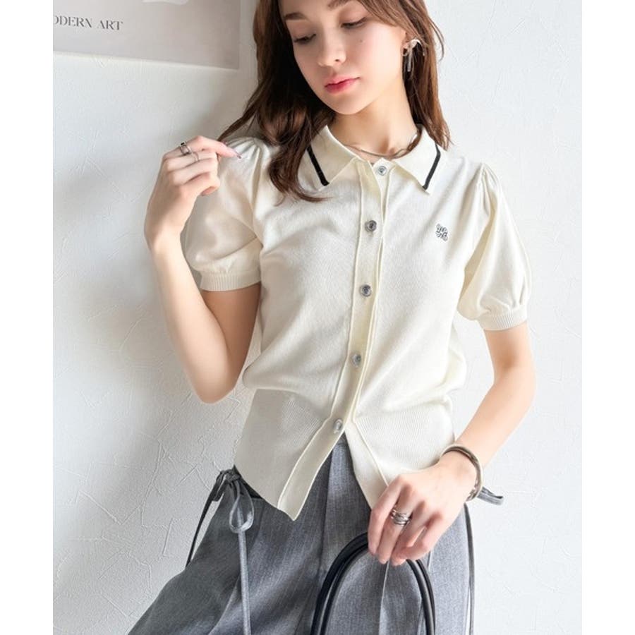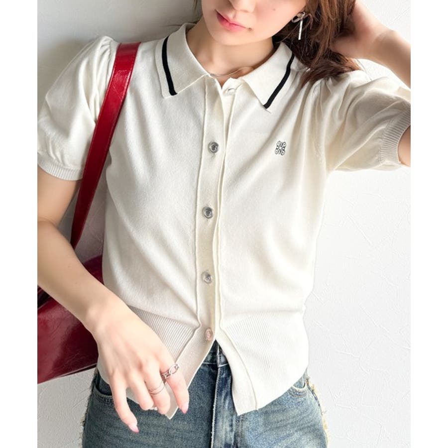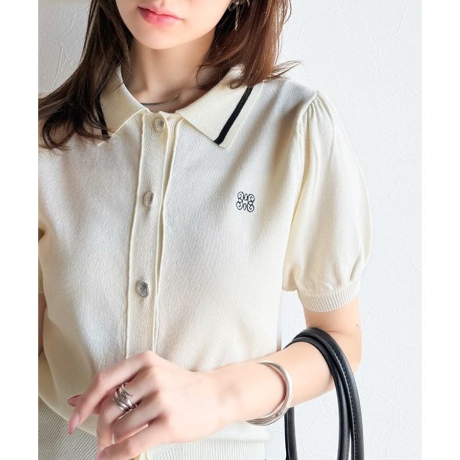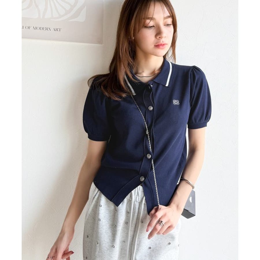 洗練された大人カジュアル。デザインボタン胸刺繍半袖ニットポロ