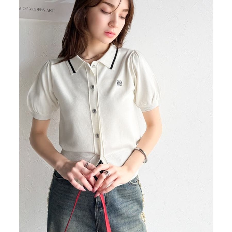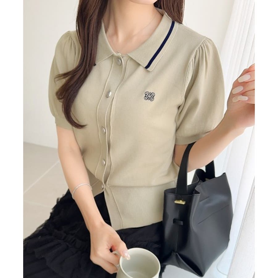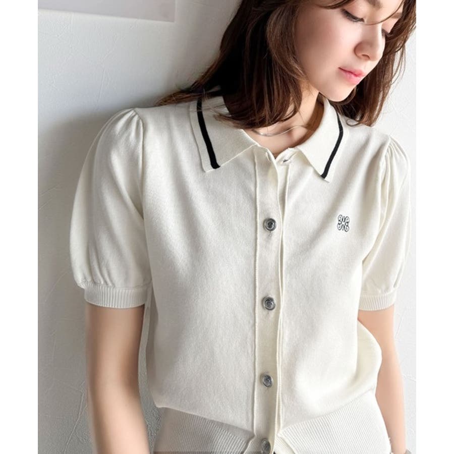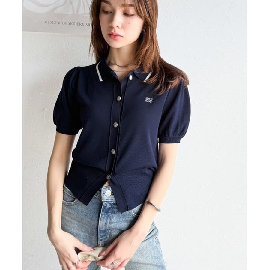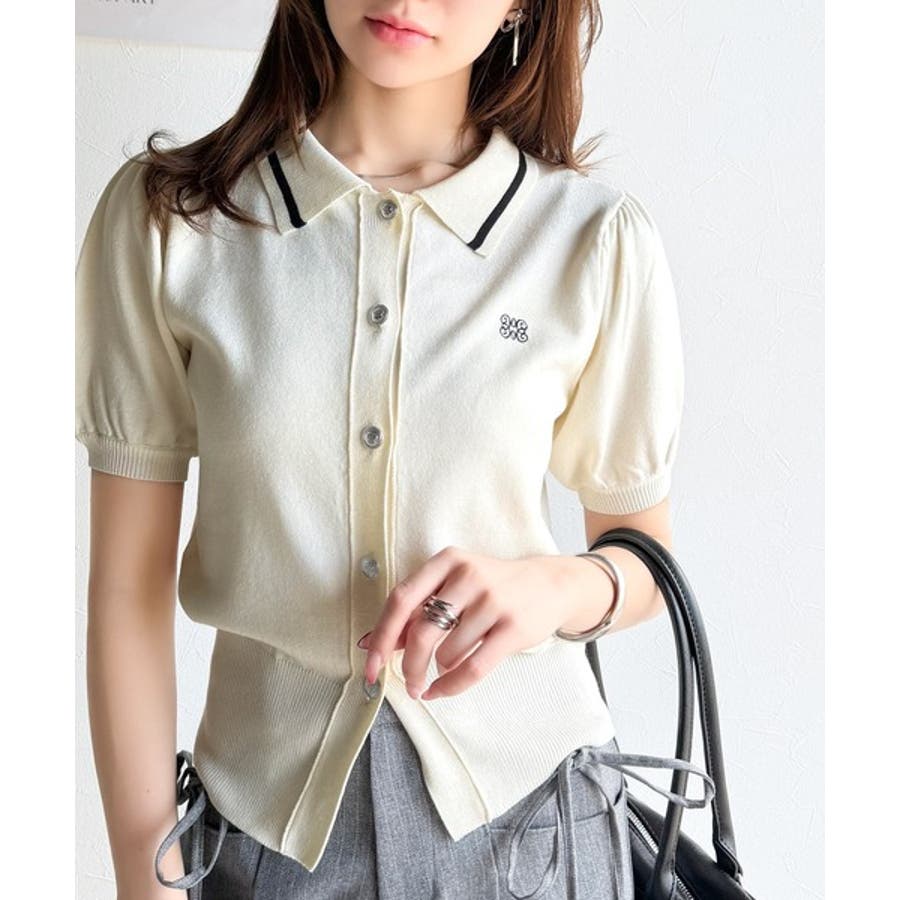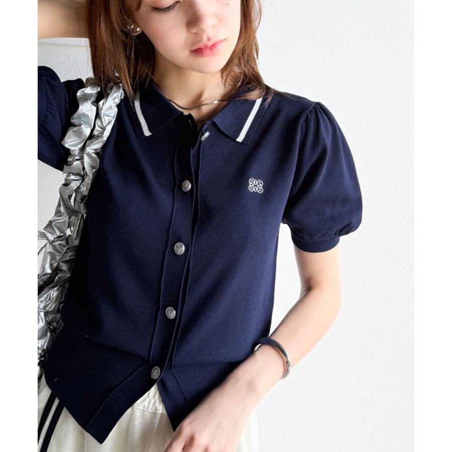 洗練された大人カジュアル。デザインボタン胸刺繍半袖ニットポロ