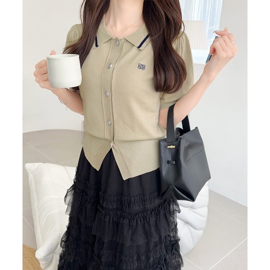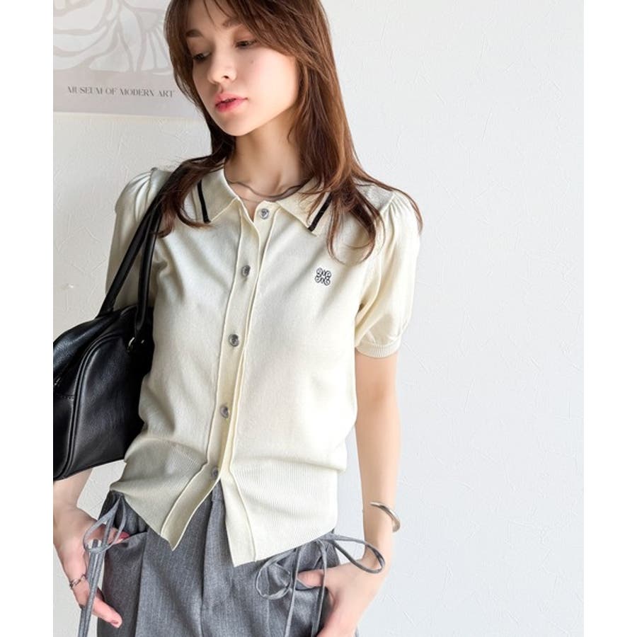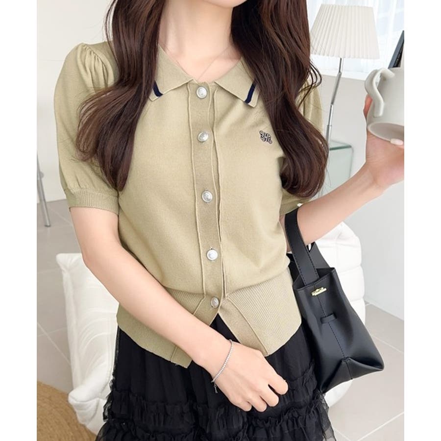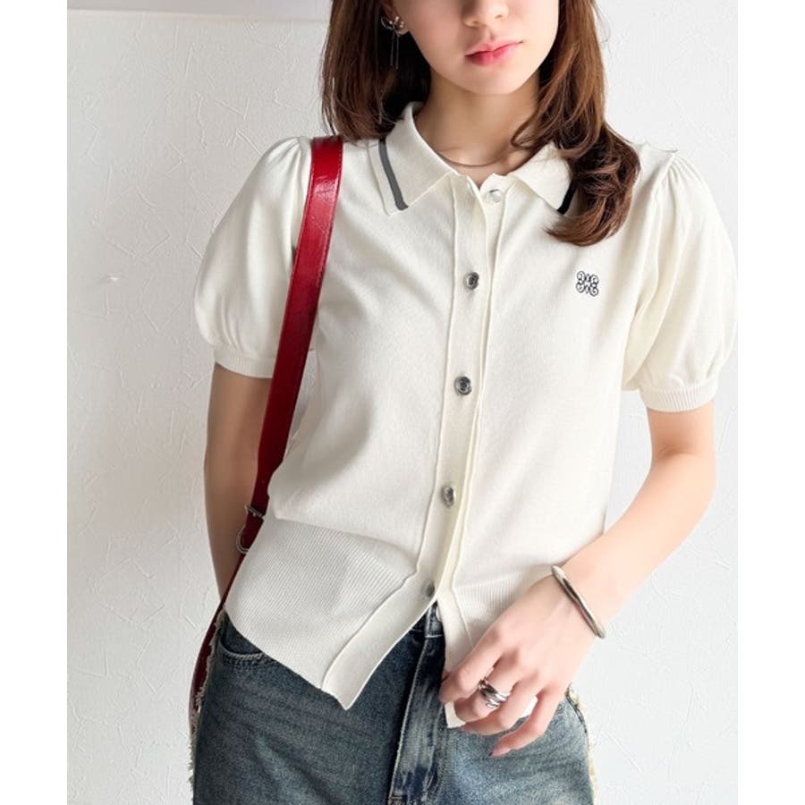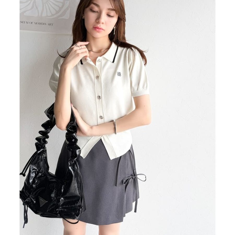 洗練された大人カジュアル。デザインボタン胸刺繍半袖ニットポロ
