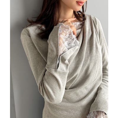 胸元と袖口にあしらわれたレースが大人のフェミニンさを演出し、