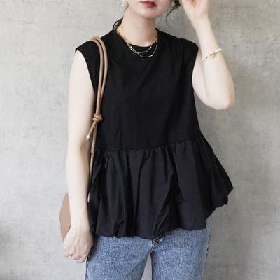 1枚で着映えする異素材切替のペプラムノースリーブTシャツが登場!