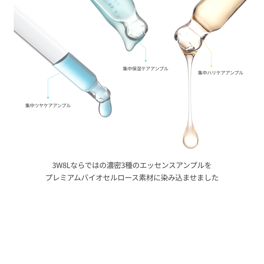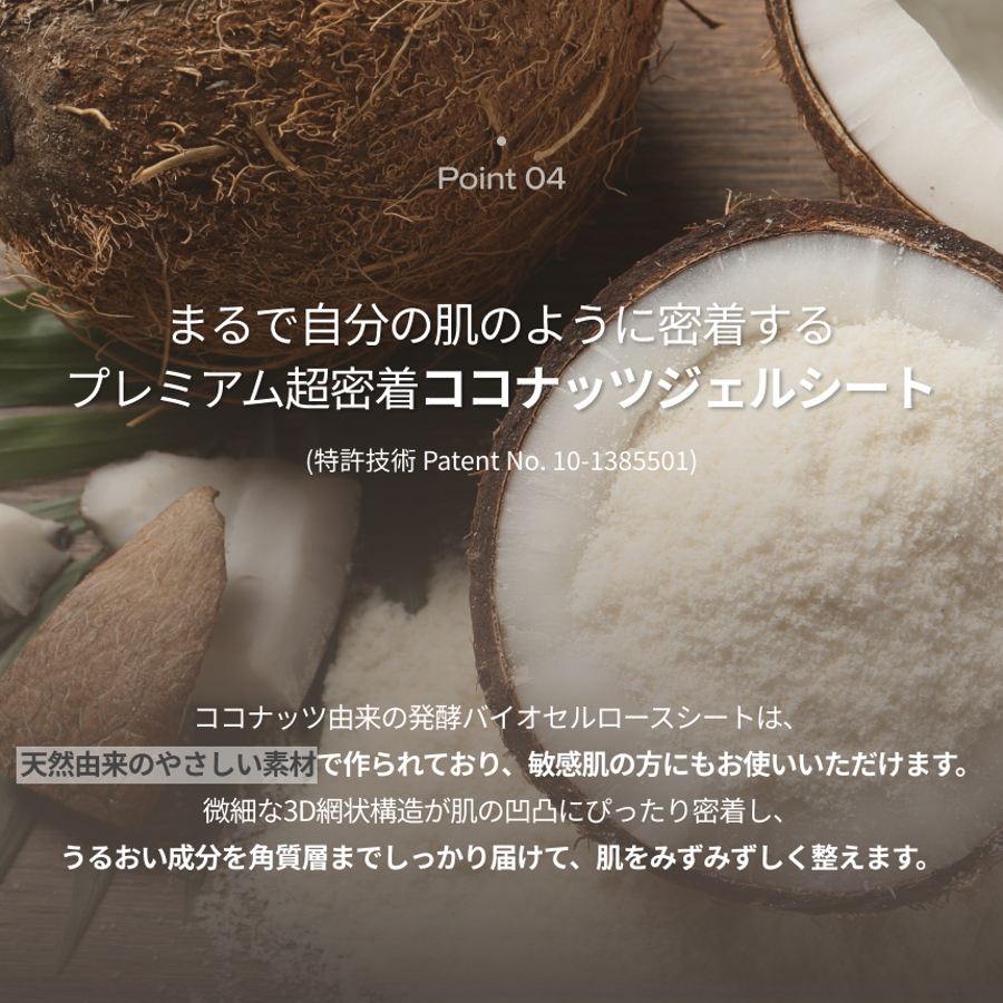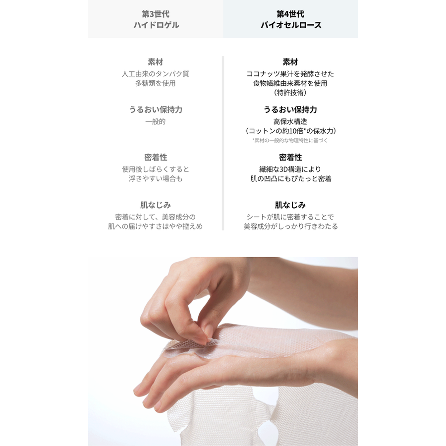 ココナッツ由来の発酵バイオセルロースシートは、天然由来のやさしい素材で作られており、敏感肌の方にもお使いいただけます。微細な3D網状構造が肌の凹凸にぴったり密着し、うるおい成分を角質層までしっかり届けて、肌をみずみずしく整えます。