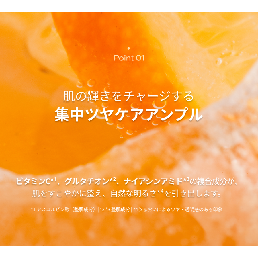 ビタミンC¹、グルタチオン²、ナイアシンアミド³の複合成分が、肌をすこやかに整え、自然な明るさ⁴を引き出します。