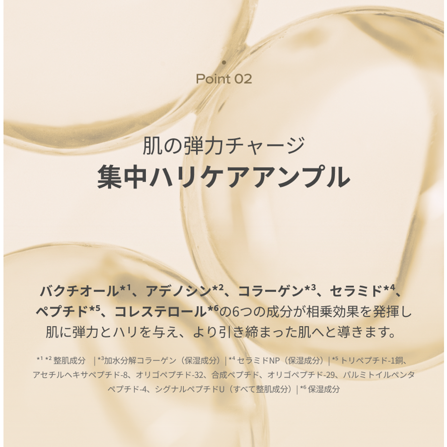 バクチオール⁵、アデノシン⁶、コラーゲン⁷、セラミド⁸、ペプチド⁹、コレステロール¹⁰の6つの成分が相乗効果を発揮し肌に弾力とハリを与え、より引き締まった肌へと導きます。