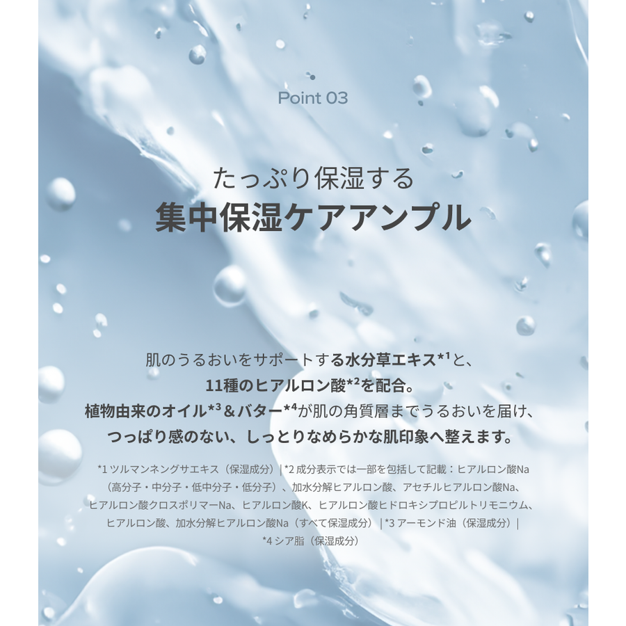 肌のうるおいをサポートする水分草エキス¹¹と、11種のヒアルロン酸¹²を配合。植物由来のオイル¹³&バター¹⁴が肌の角質層までうるおいを届け、つっぱり感のない、しっとりなめらかな肌印象へ整えます。