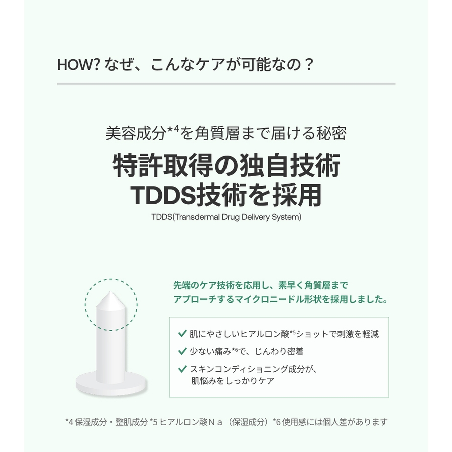 やさしいマイクロニードル形状により、少ない痛み*⁵で肌に密着。美容成分が角質層のすみずみまでじんわり届きます。