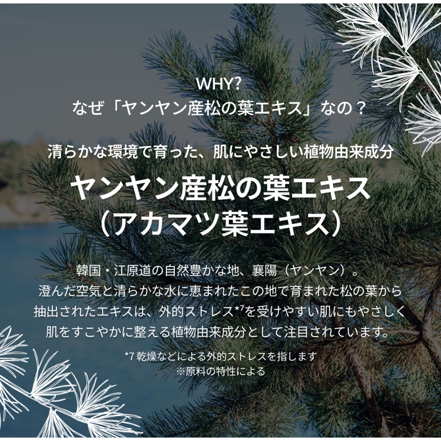 清らかな自然環境で育った松の葉から抽出した整肌成分をはじめ、すこやかさをサポートする美容成分を厳選配合。