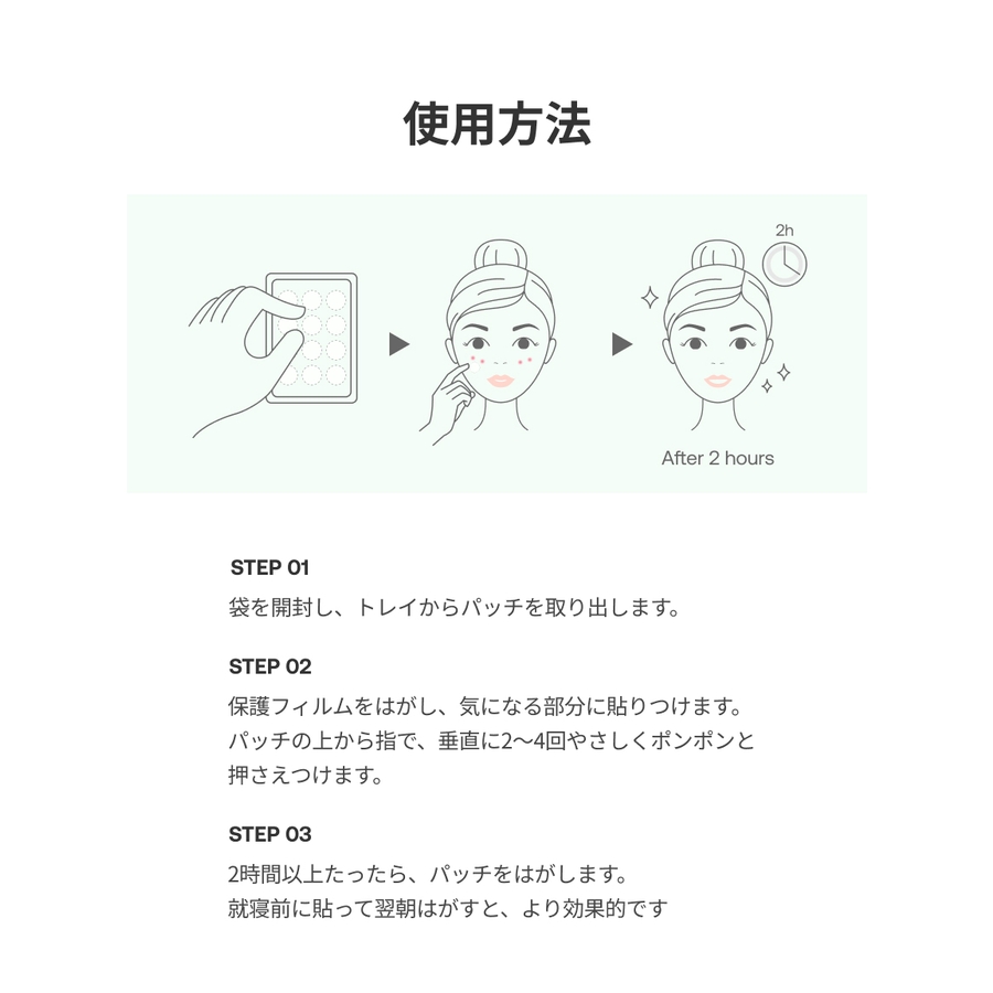 (2) 透明フィルムをはがし、気になる部分に貼りつけます。パッチの上から指で、垂直に2~4回やさしくポンポンと押さえつけます。