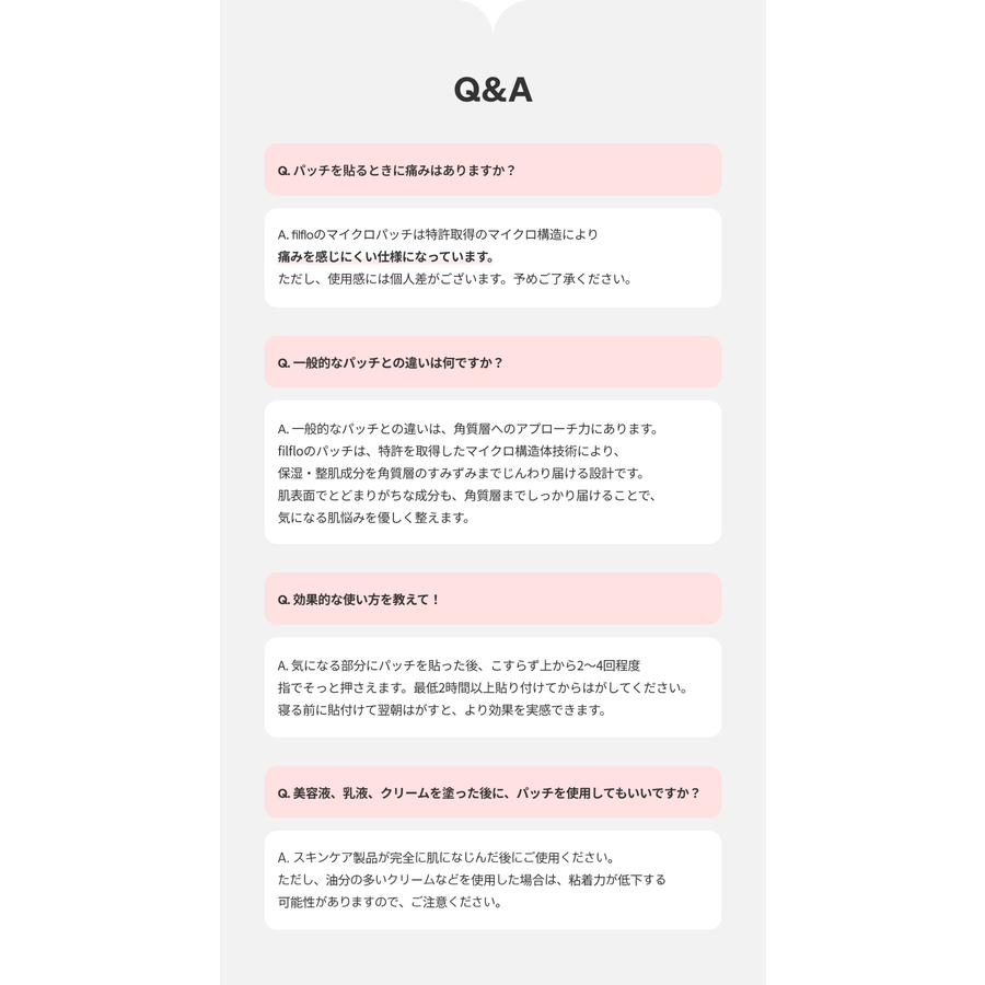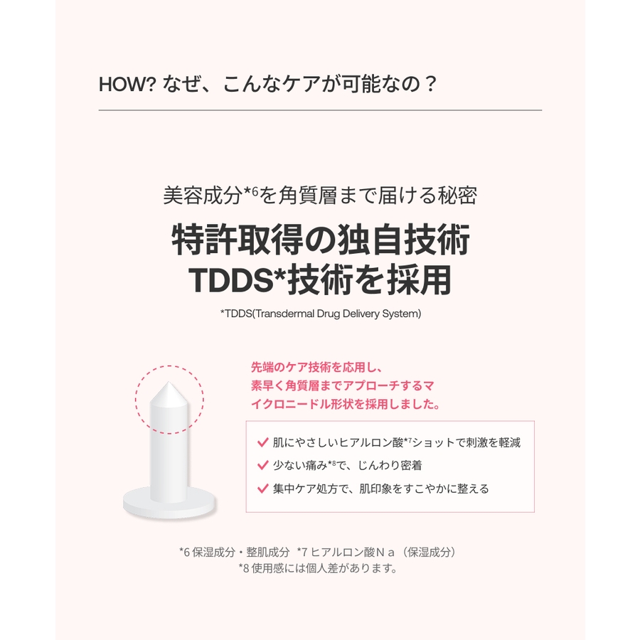 ヒアルロン酸*⁵*を用いたマイクロニードル構造が、肌へのやさしさを保ちながら、ピタッと密着。少ない痛み*⁶でじんわりアプローチ。