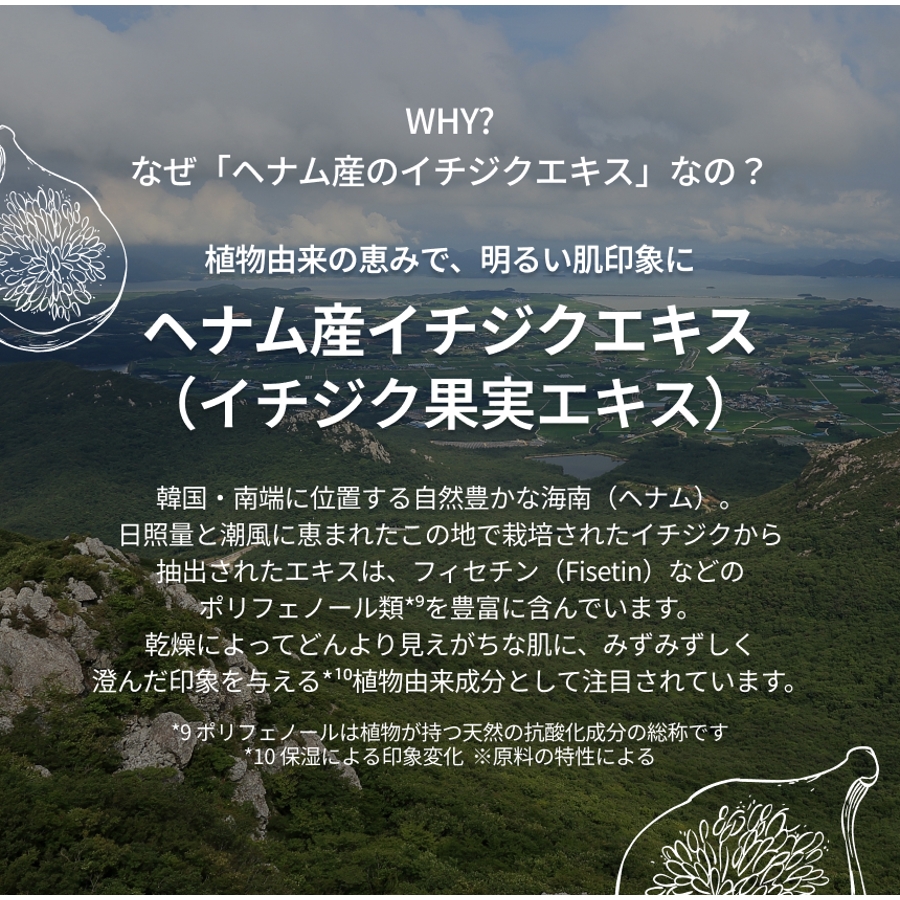 韓国・海南(ヘナム)産のイチジク果実エキスをはじめとする整肌成分や、バリア機能をサポートする保湿成分をバランスよく配合。