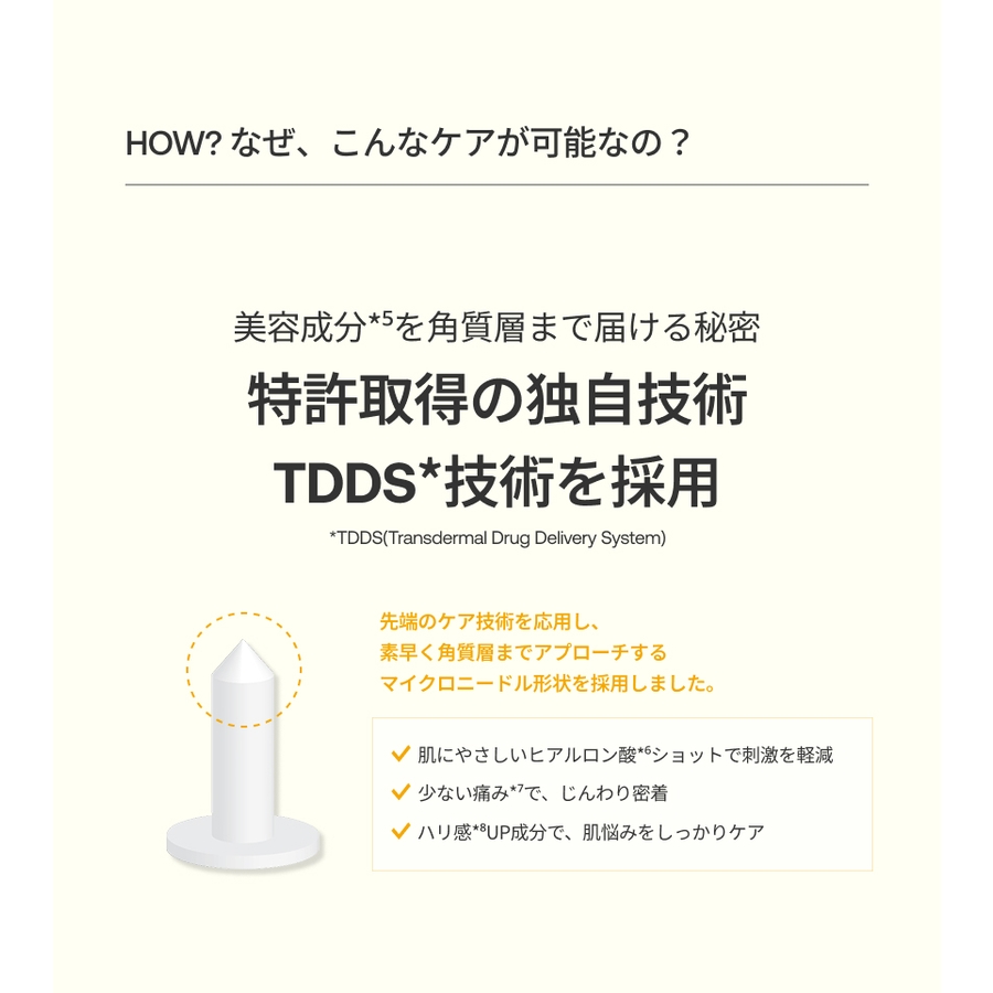 肌にやさしいヒアルロン酸*⁴マイクロニードルが、気になる部分にぴたりと密着。少ない痛み*⁵でじんわりアプローチ。