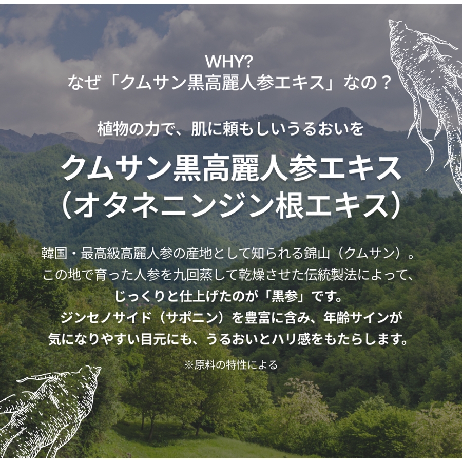 世界重要農業遺産に登録された錦山(クムサン)産のブラックジンセンをはじめ、整肌・保湿・ハリ感に着目した成分をバランスよく配合。乾燥による小ジワが気になる方にも。