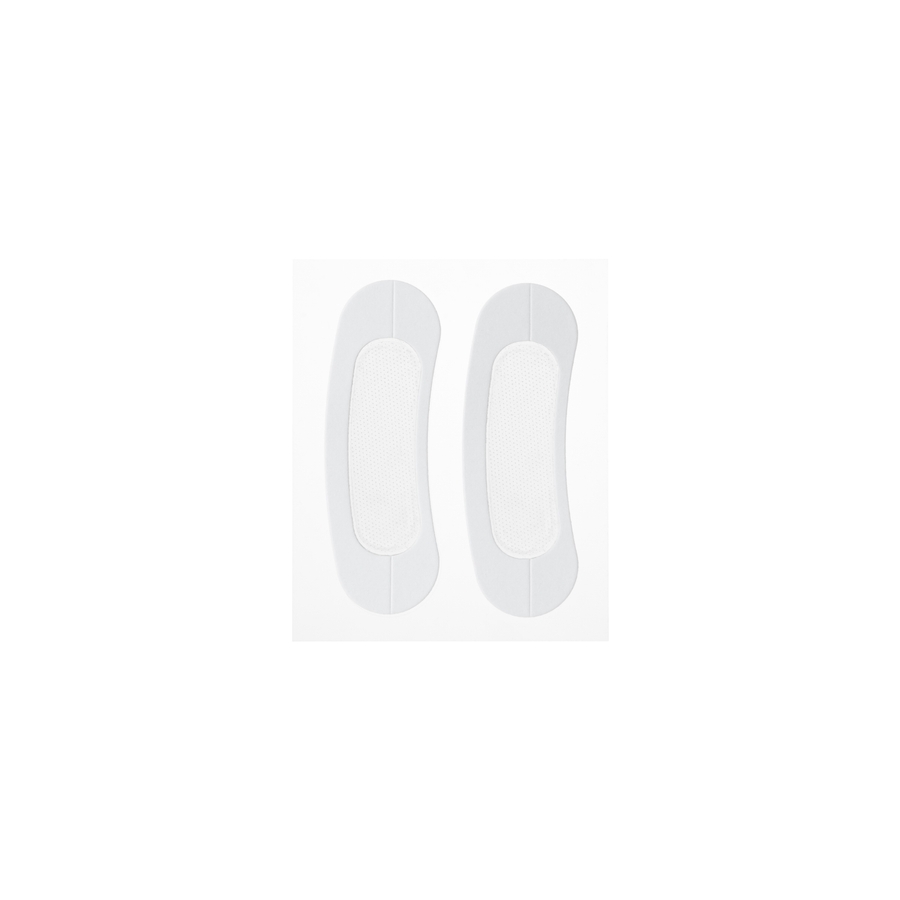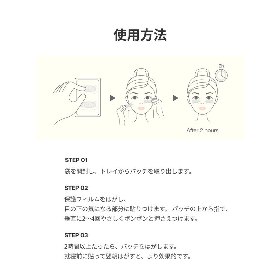 (2) 保護フィルムをはがし、目の下の気になる部分に貼りつけます。その後、パッチの上から指で垂直に2~4回やさしくポンポンと押さえます。