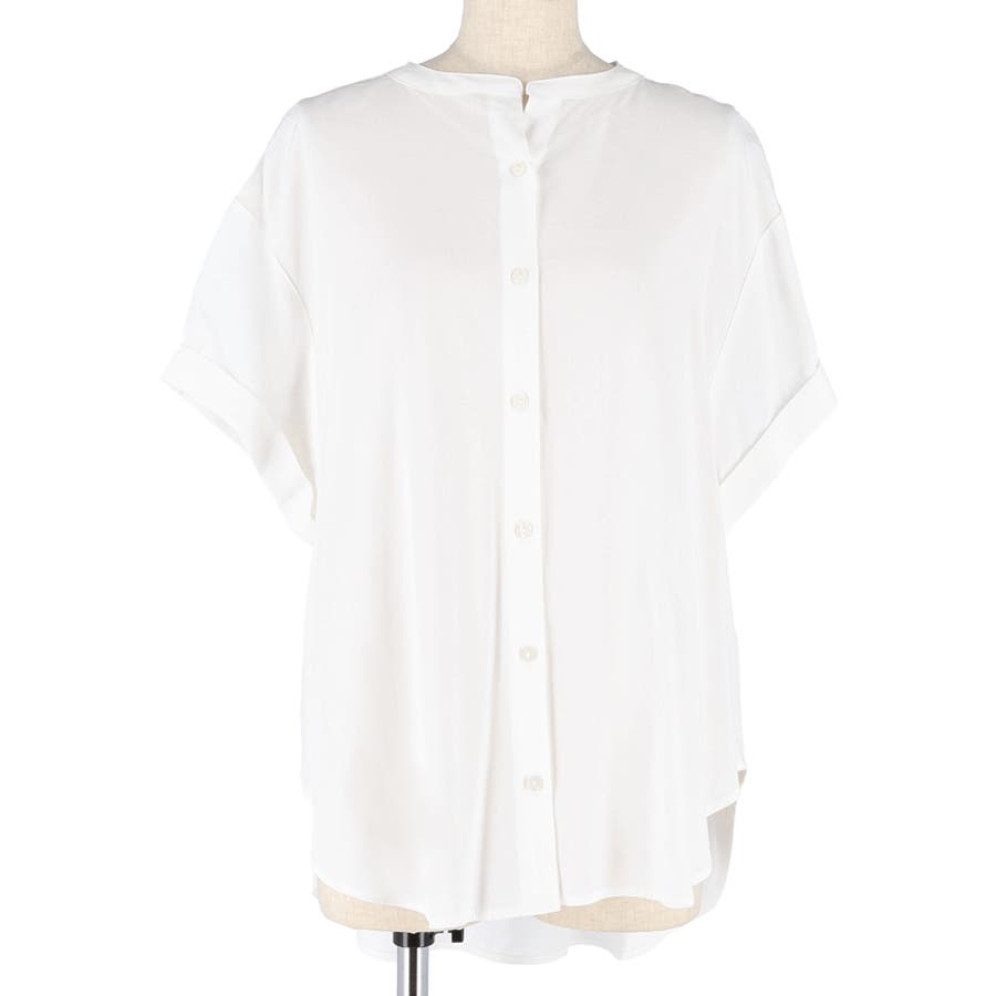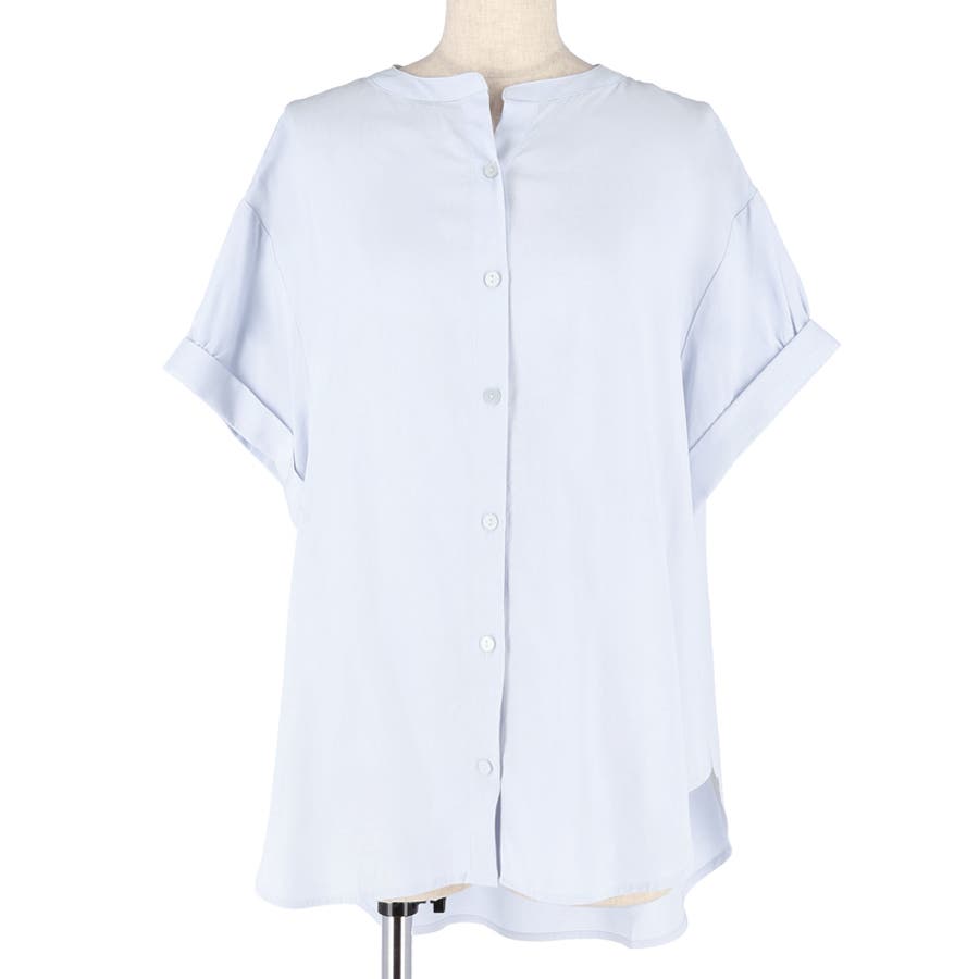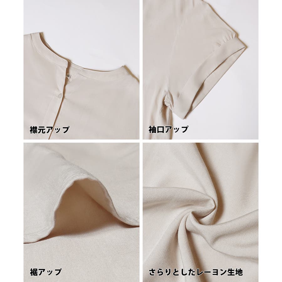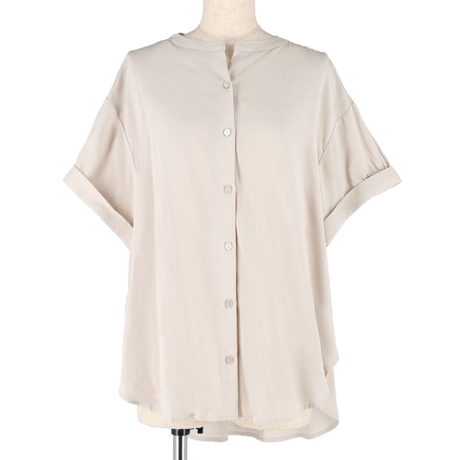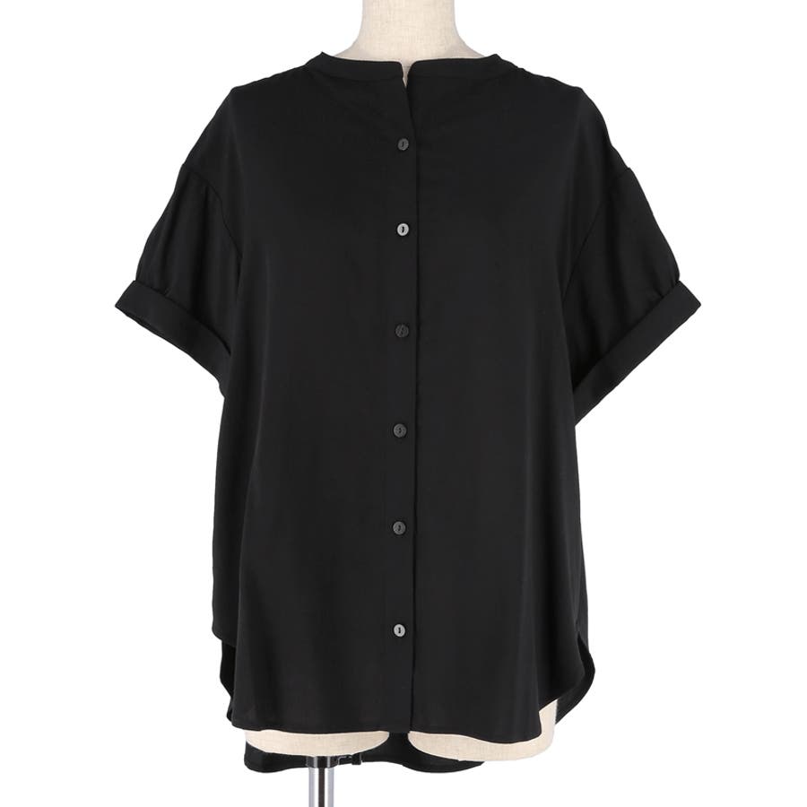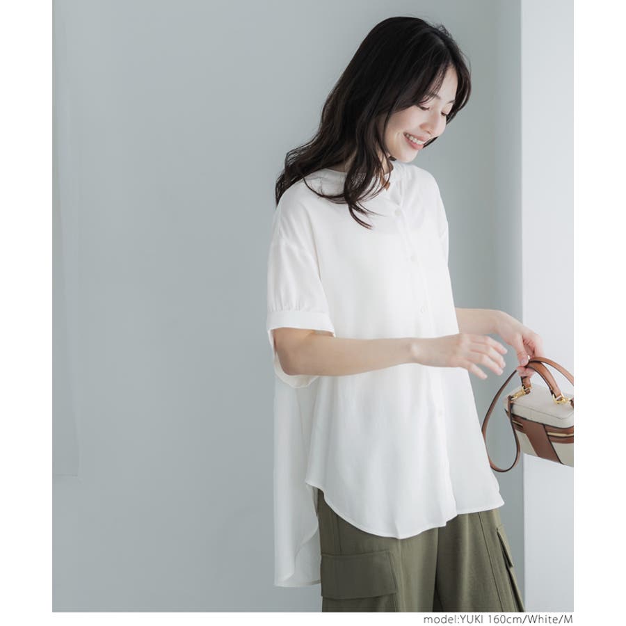 ブラウス レディース レーヨン スキッパー 袖ギャザー 羽織り シャツ 前後差 ミディアム丈 無地 薄手 半袖 きれいめ トップス バンドカラーシャツ 前開き ヴィンテージレーヨン 半袖ブラウス ラウンドテール フロントボタン 光沢感 ベーシック コカ COCA coca COCA coca