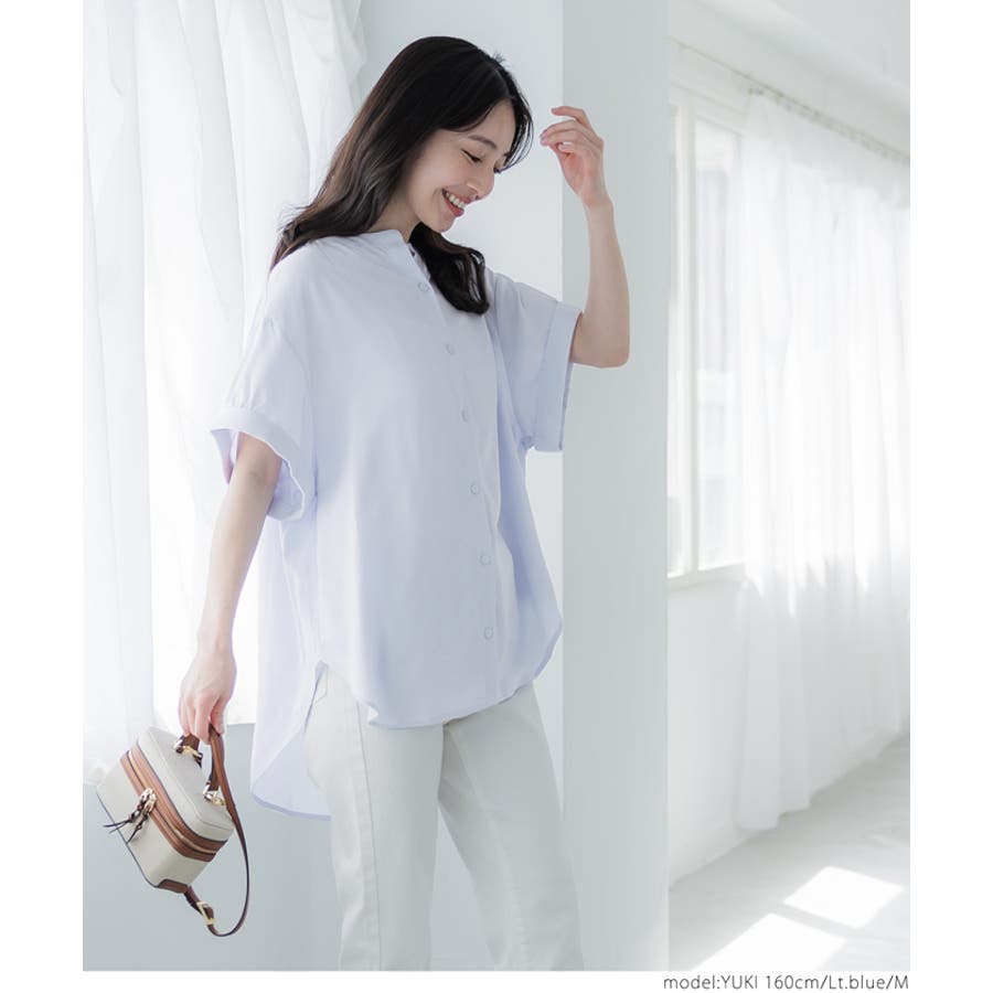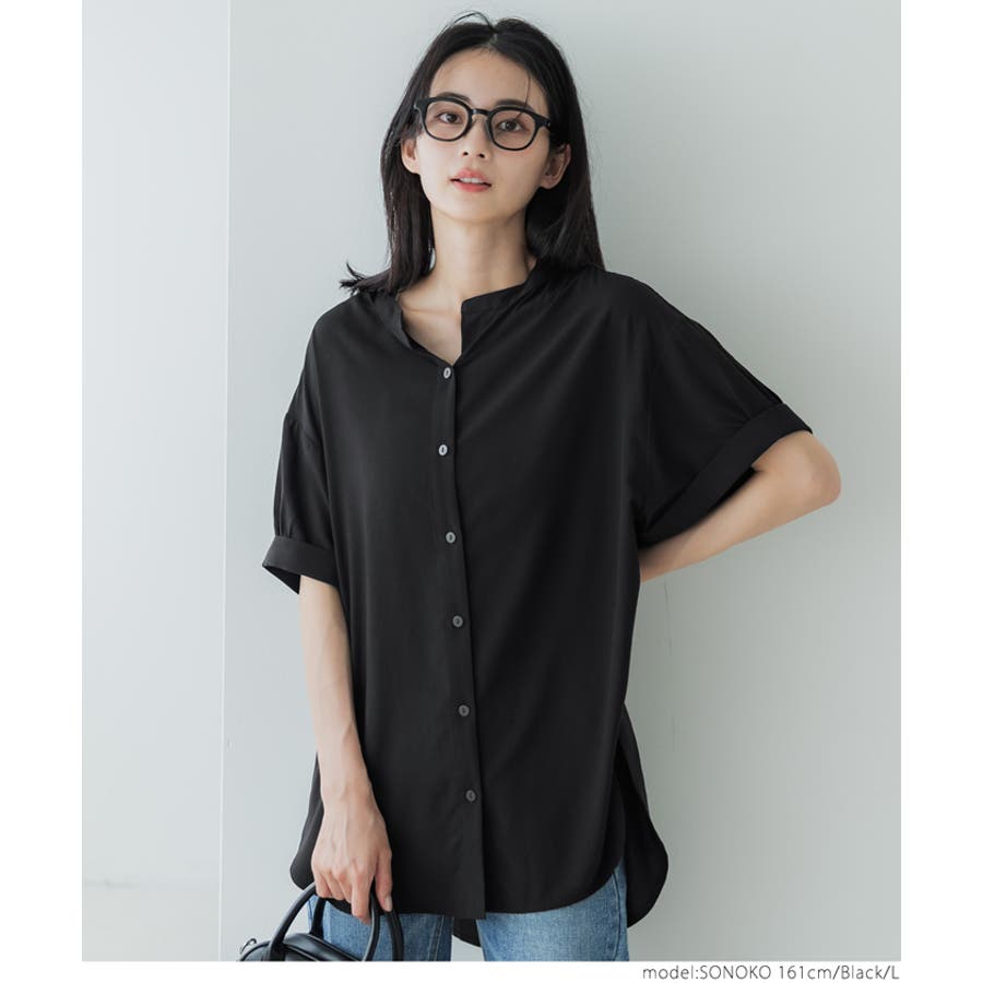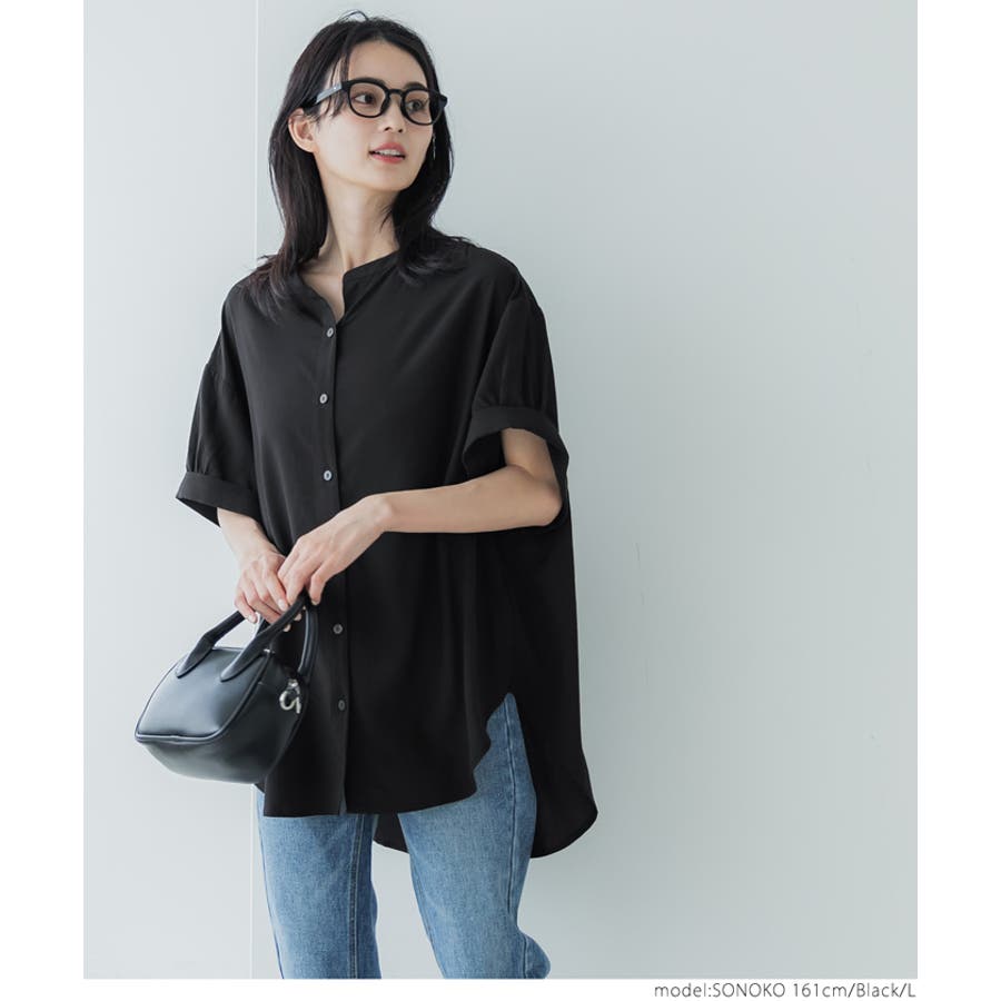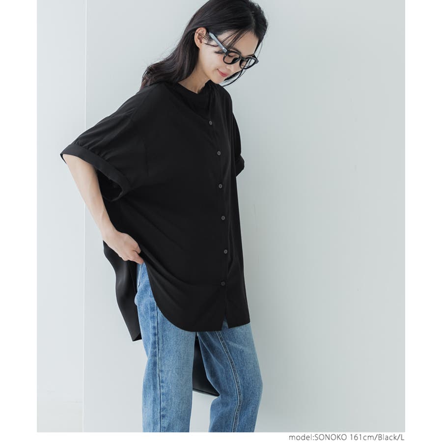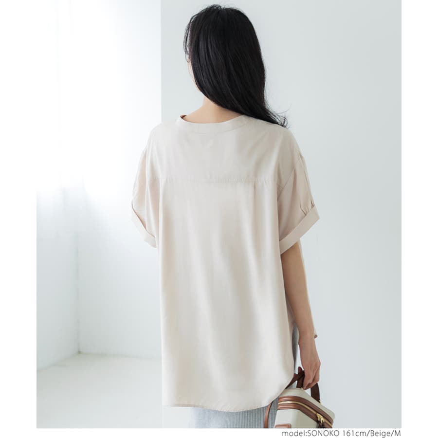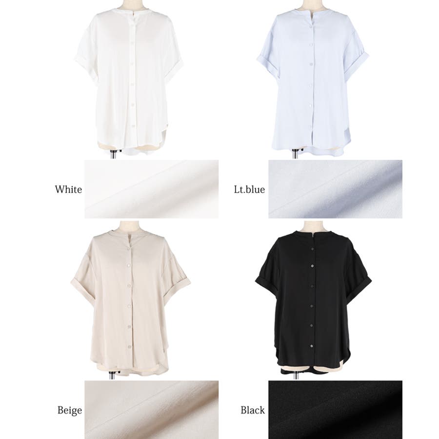 ブラウス レディース レーヨン スキッパー 袖ギャザー 羽織り シャツ 前後差 ミディアム丈 無地 薄手 半袖 きれいめ トップス バンドカラーシャツ 前開き ヴィンテージレーヨン 半袖ブラウス ラウンドテール フロントボタン 光沢感 ベーシック コカ COCA coca COCA coca