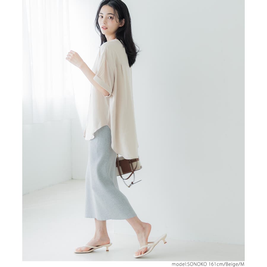 タイトスカートに合わせたり、インしてパンツやロングスカートでも合うし、何にでも合うと思います。