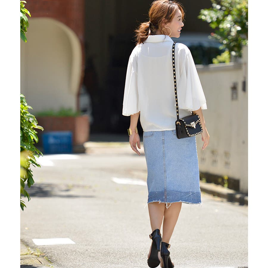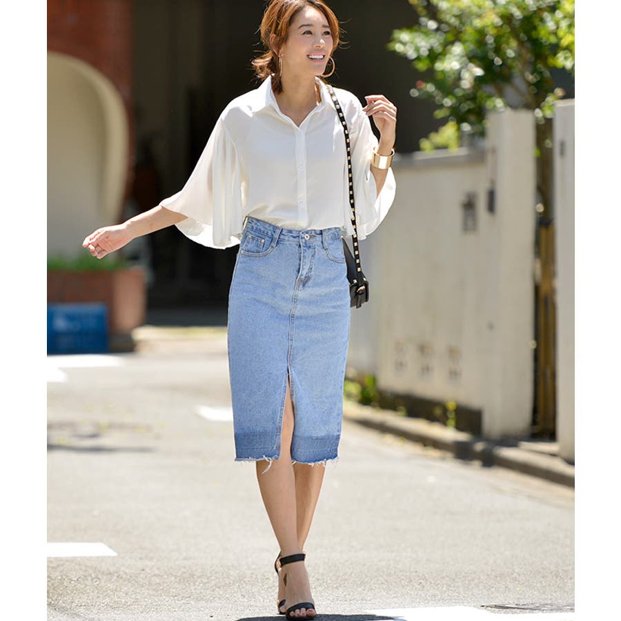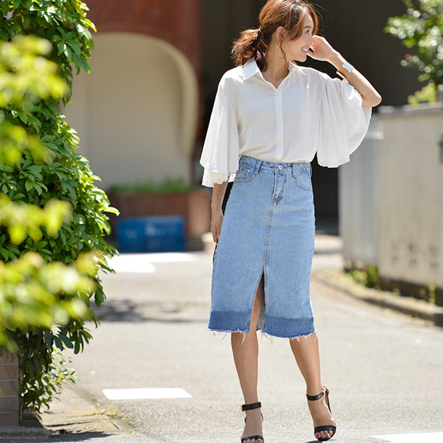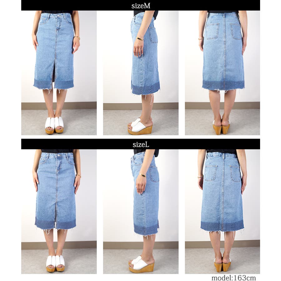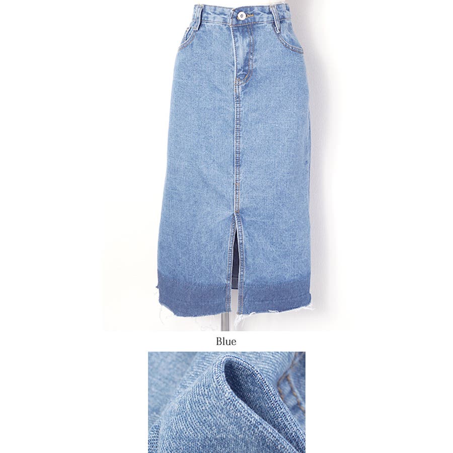 グラデーションスリットデニムスカート(フリンジ ハーフ丈 フレイドヘム