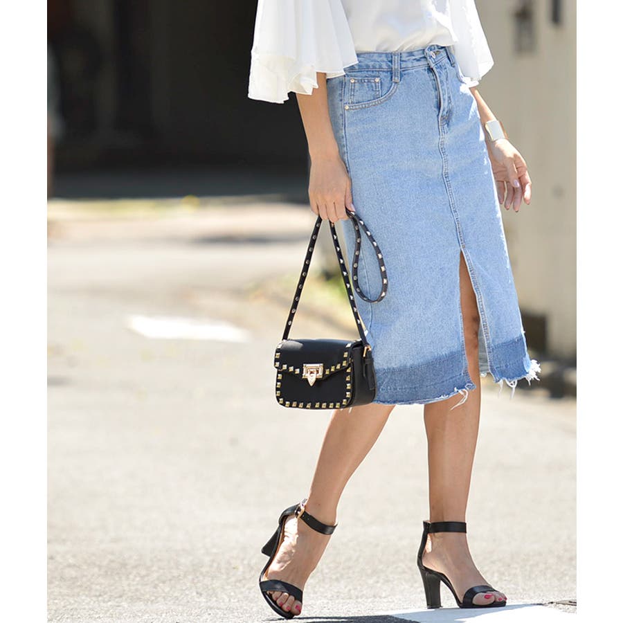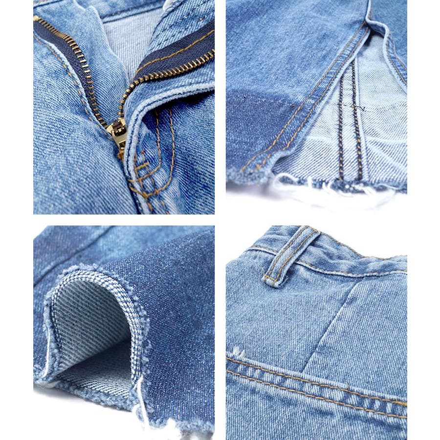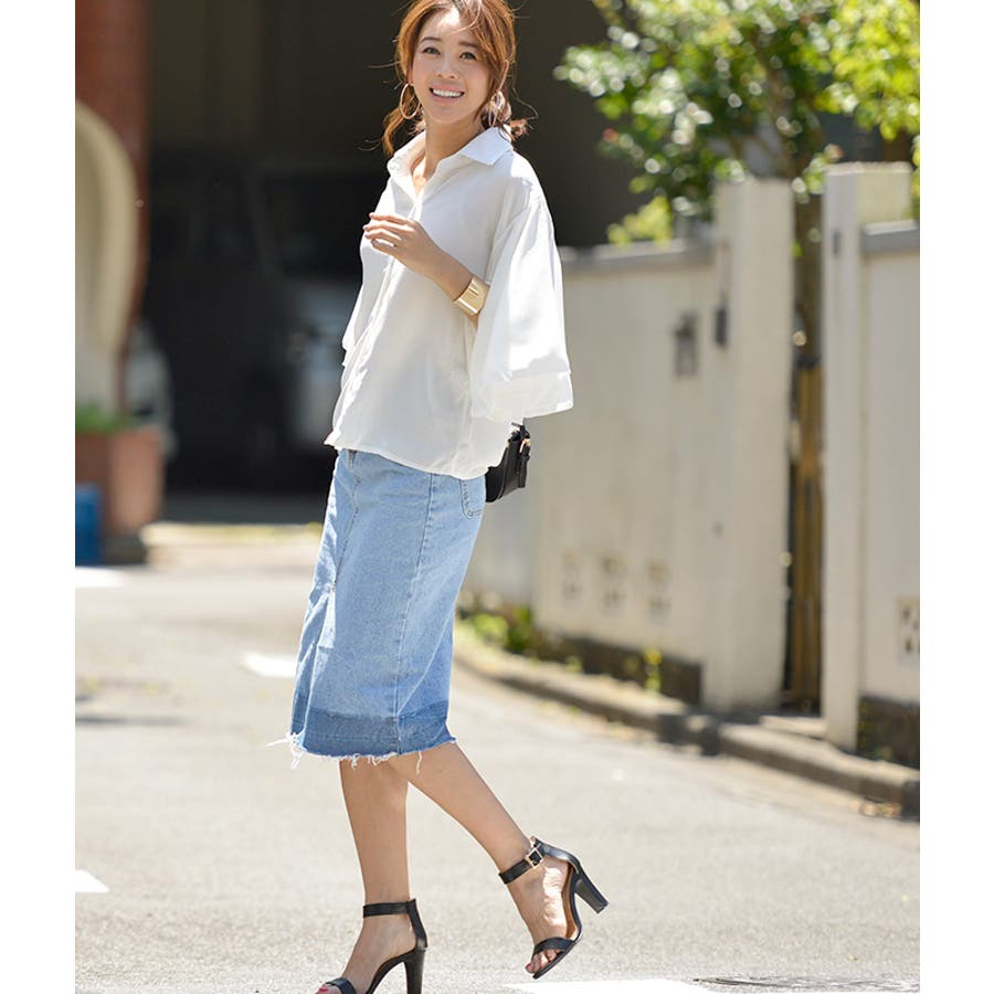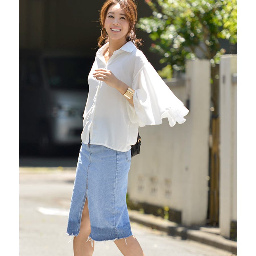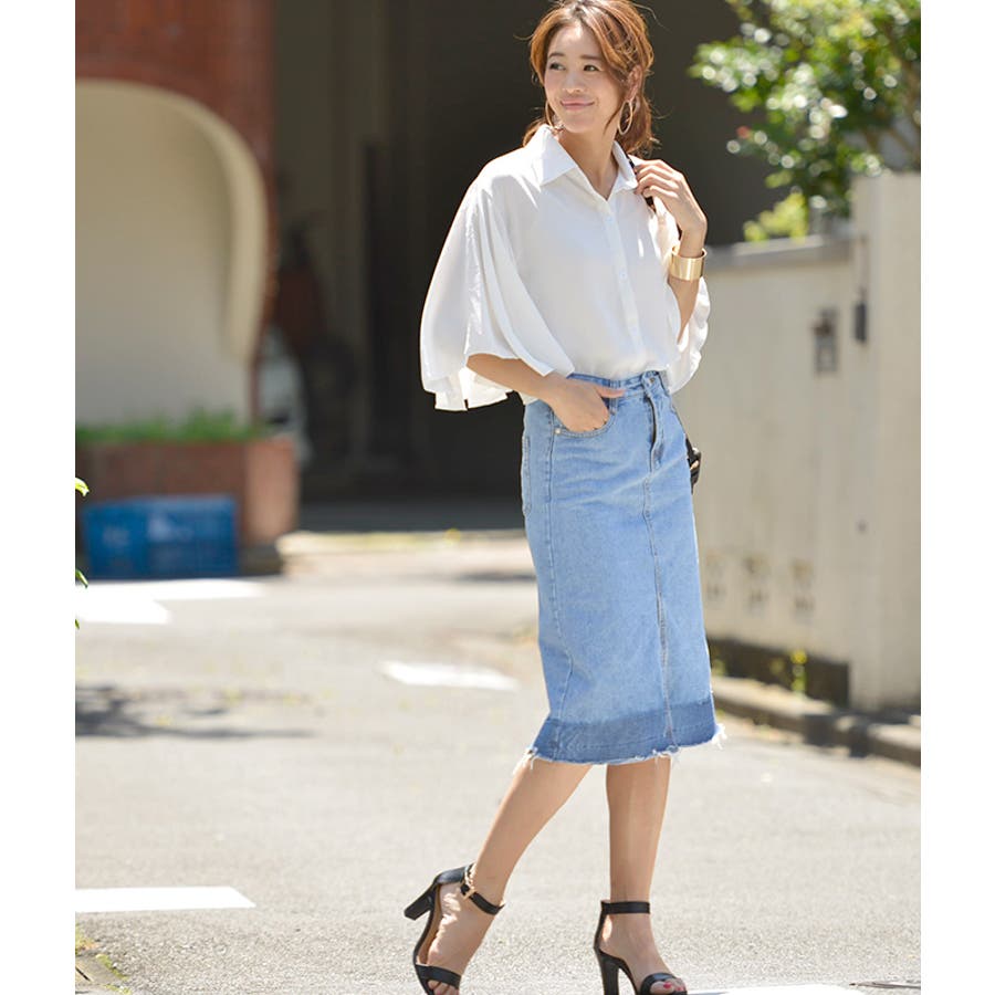 グラデーションスリットデニムスカート(フリンジ ハーフ丈 フレイドヘム