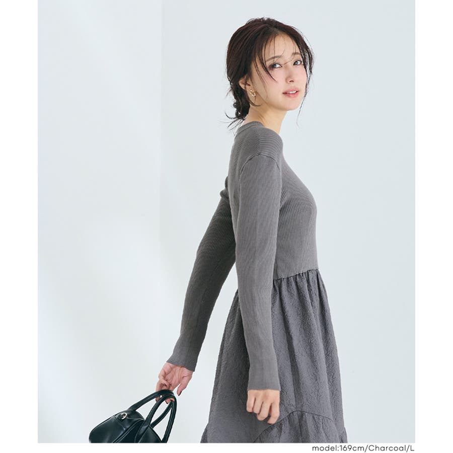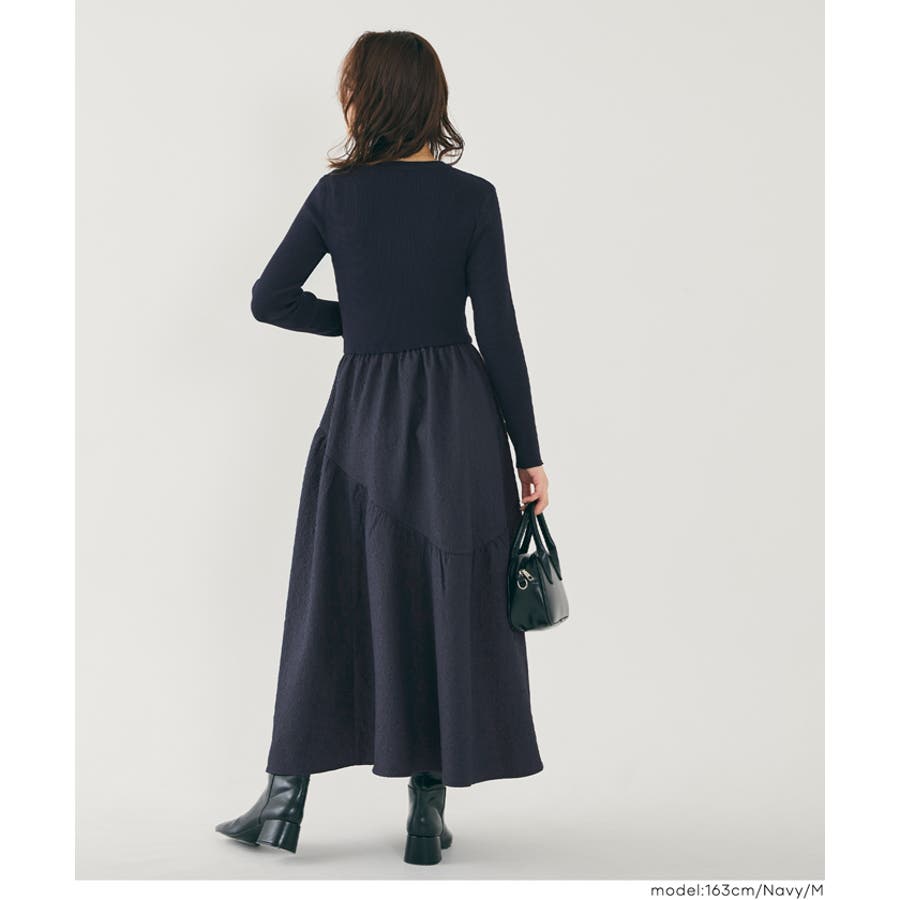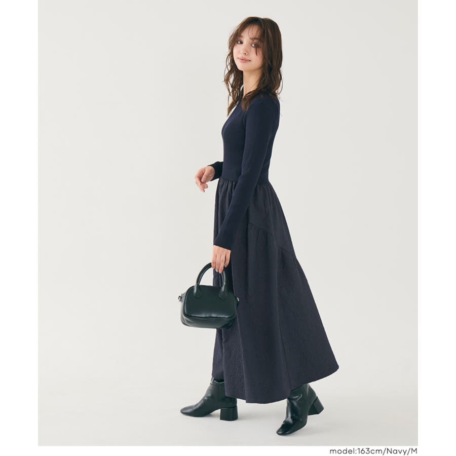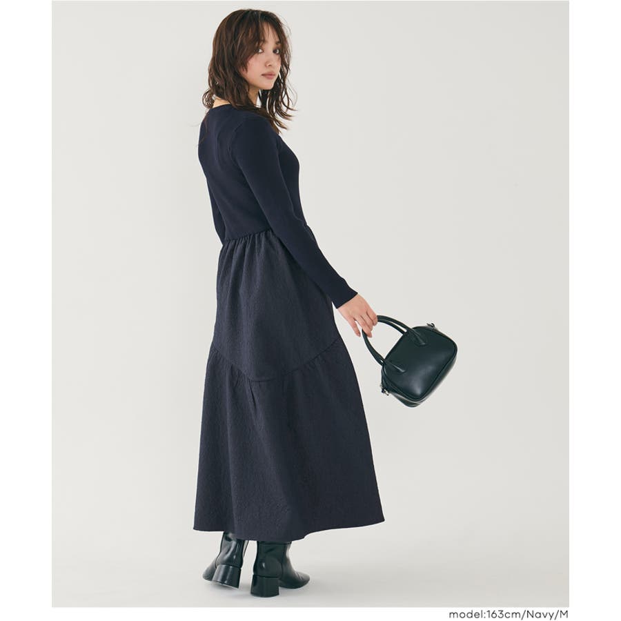 上身頃はすっきりとしたニット、スカートはボリュームのあるエンボス生地を合わせた上品なドッキングデザイン。