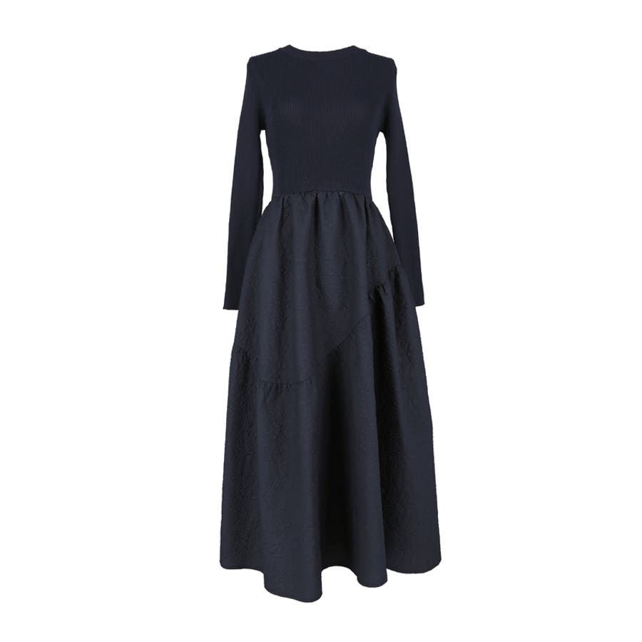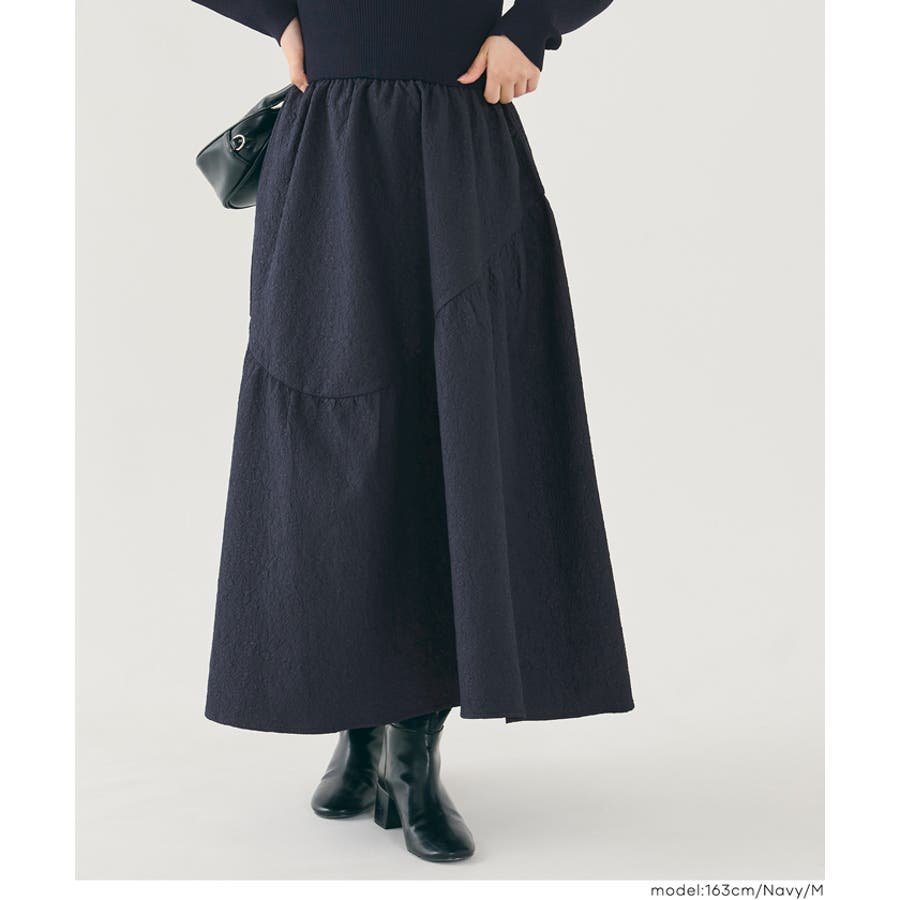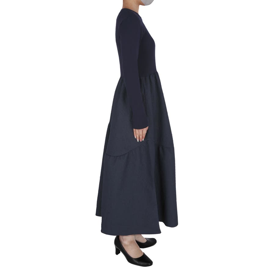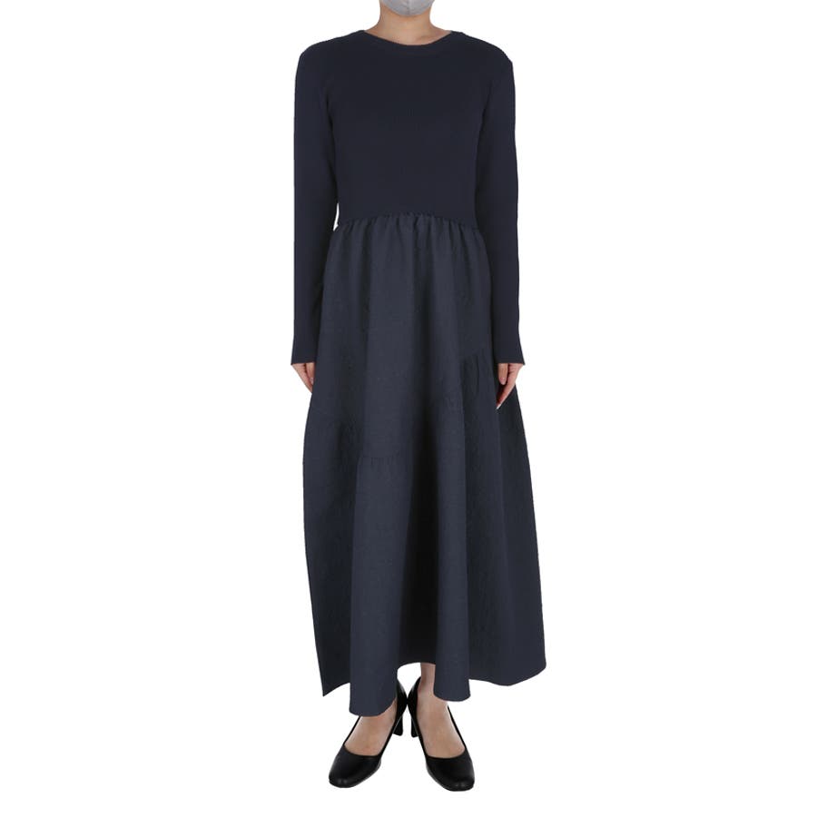 上身頃はすっきりとしたニット、スカートはボリュームのあるエンボス生地を合わせた上品なドッキングデザイン。