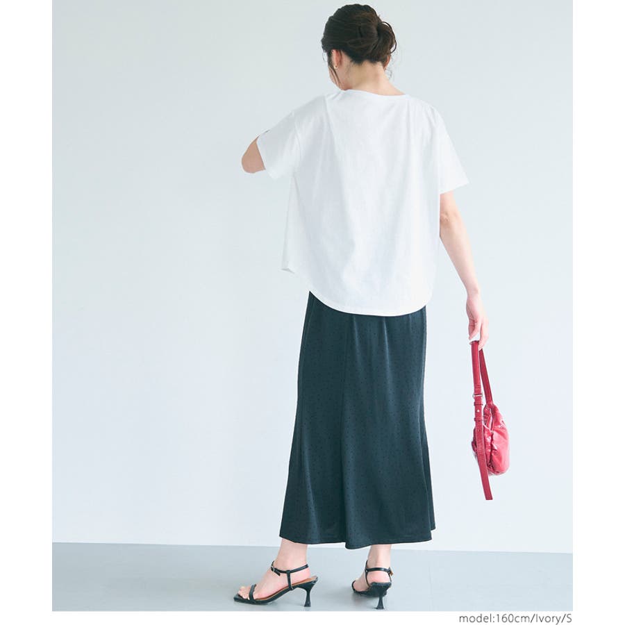 気になる腕やお腹まわりをカバーするゆとりのあるシルエットと、前後差のあるテールカットデザインがポイント。