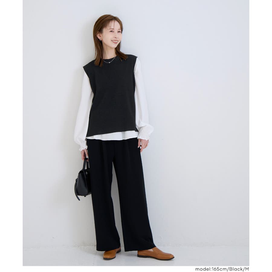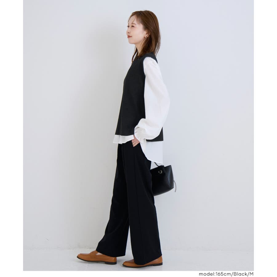 ニットベストとブラウスの2点セットで、一枚で大人っぽいレイヤードスタイルが完成。