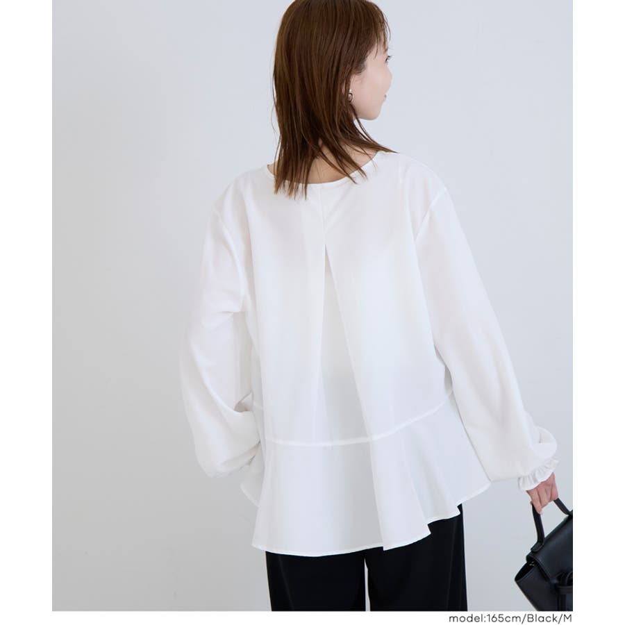ブラウスは後ろが長めのテールカットで、気になる腰まわりを自然にカバー。