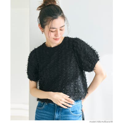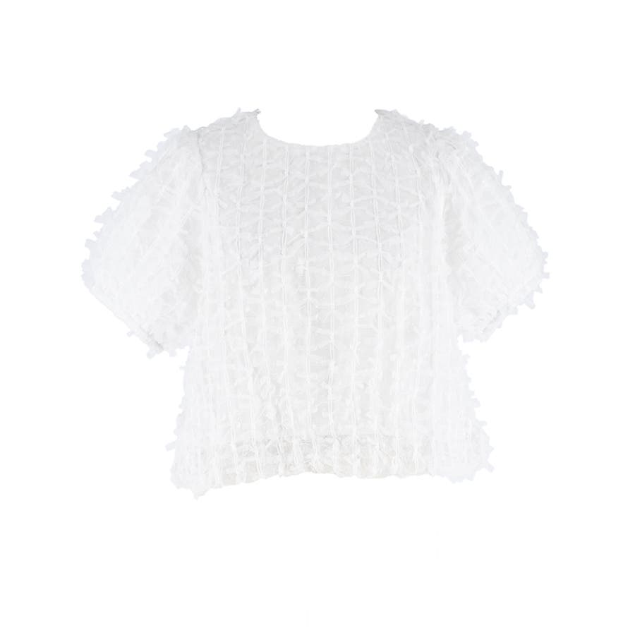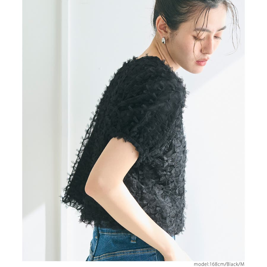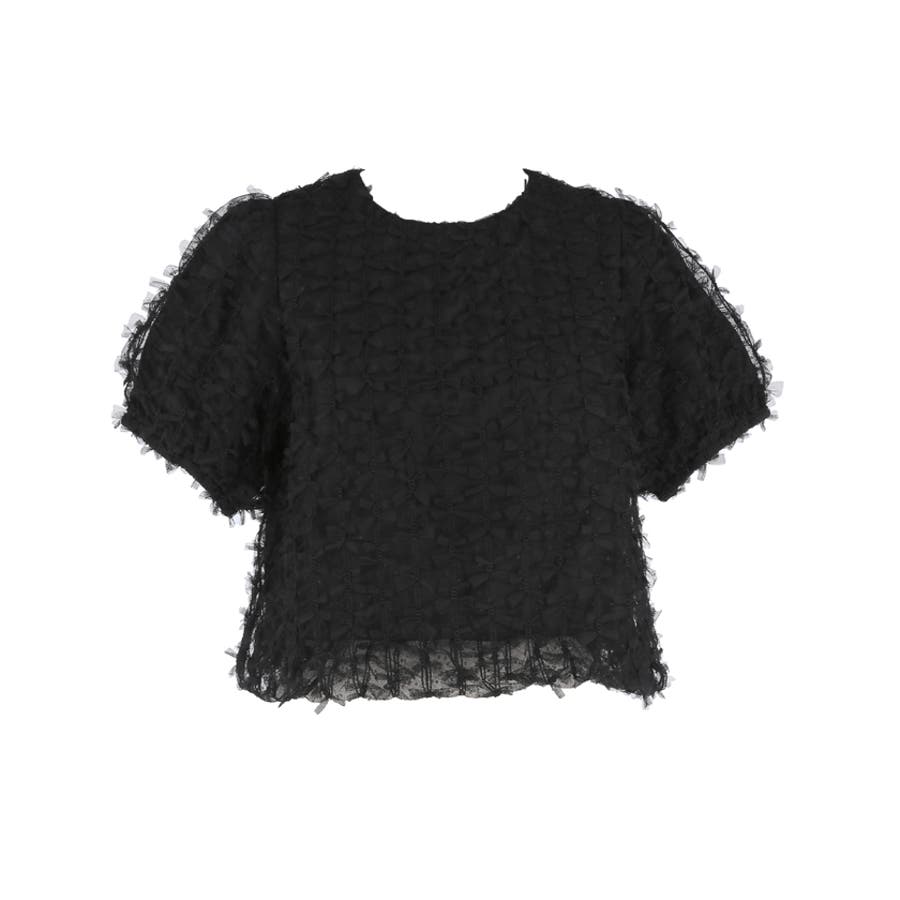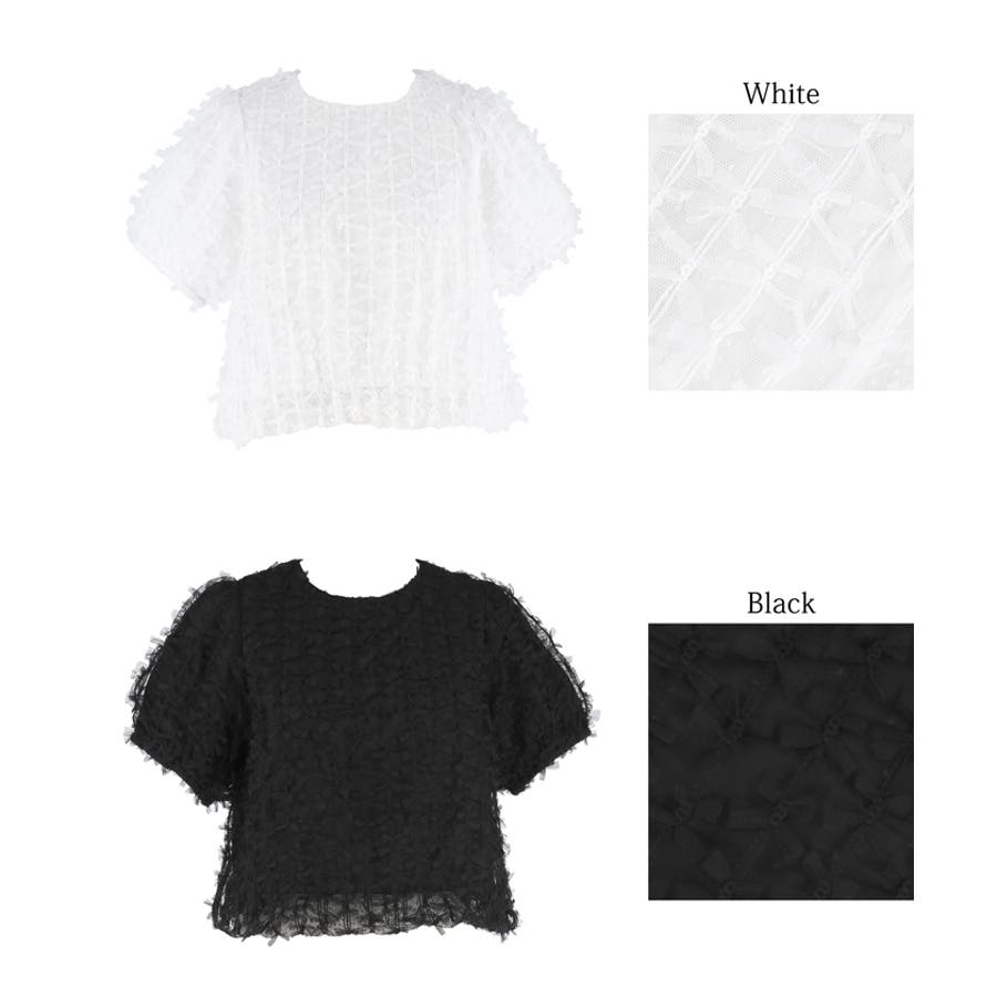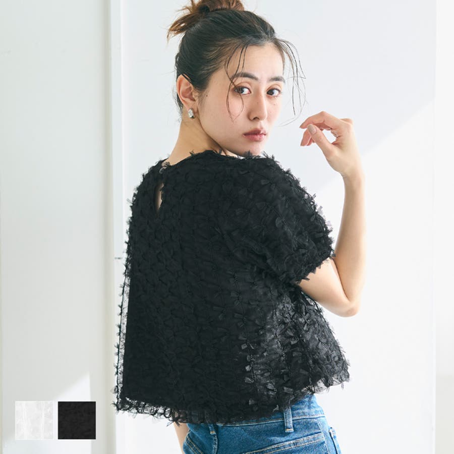リボンが全面にあしらわれた華やかなデザインが魅力のショート丈ブラウス