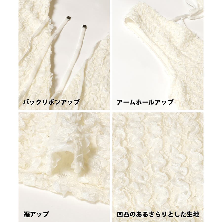 繊細なフラワーモチーフが上品な印象を添え、バックリボンのアクセントで後ろ姿まで可愛く。