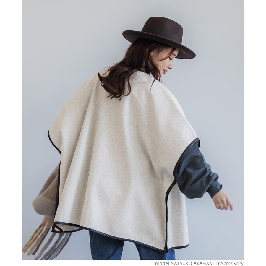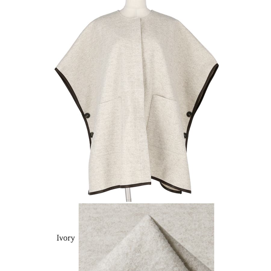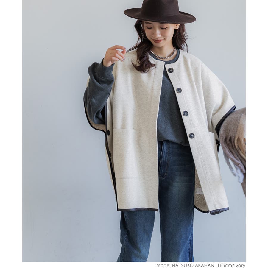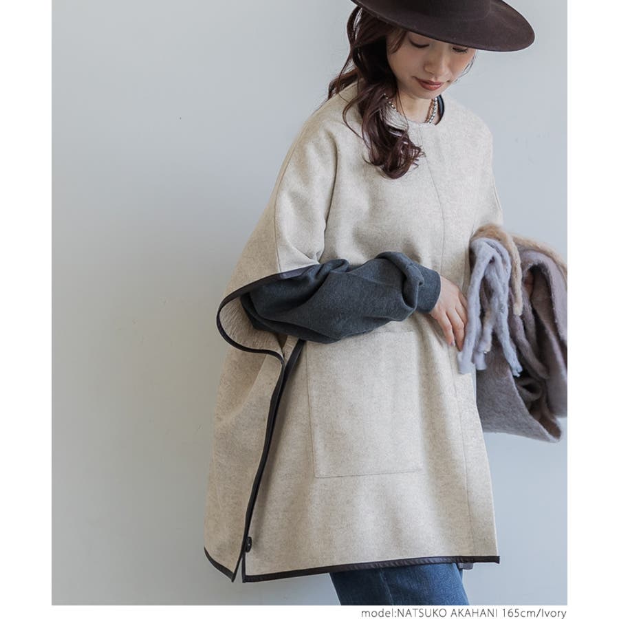 ポンチョ レディース コート 羽織 ニットモッサ ポケット レザーパイピング ビックシルエット 配色 アウター ジャケット ウールライク ニットモッサポンチョ 前開き 配色 無地 マタニティ コカ COCA coca COCA coca