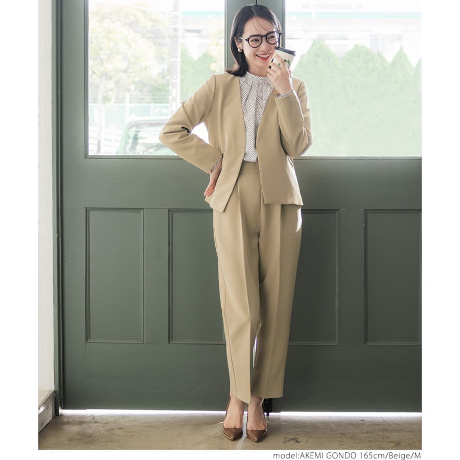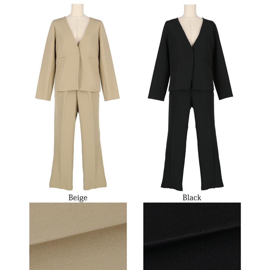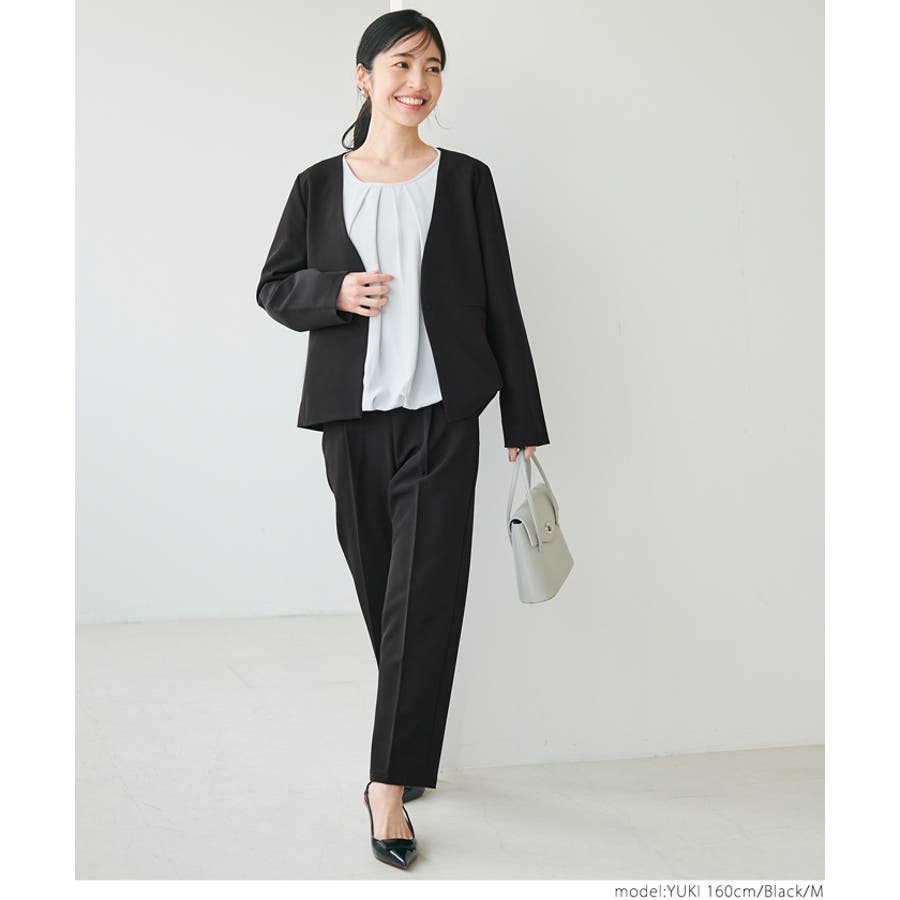 セットアップスーツ レディース スーツ 3D ストレッチ ジャケット フロントホック パンツ ポケット ウエストゴム 無地 セットアップ アウター ボトムス セット ノーカラージャケット テーパードパンツ タック セレモニー フォーマル オフィス きれいめ コカ COCA coca COCA coca