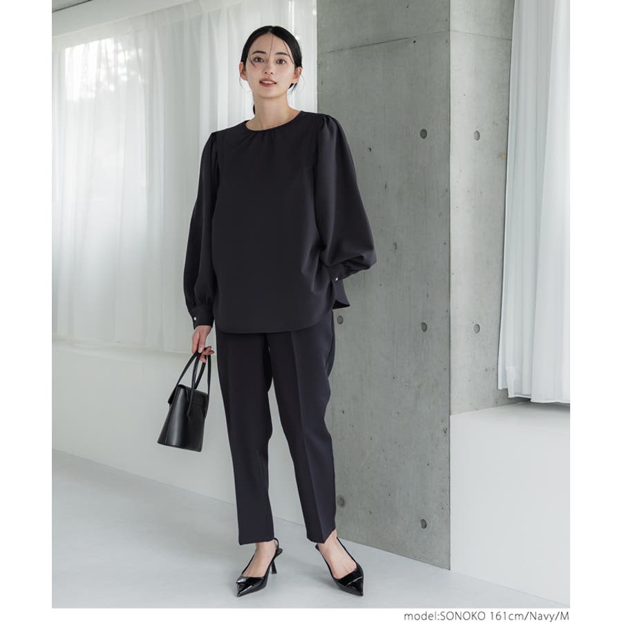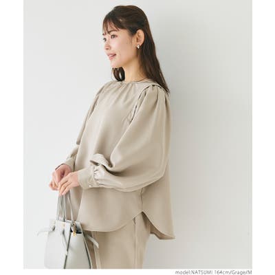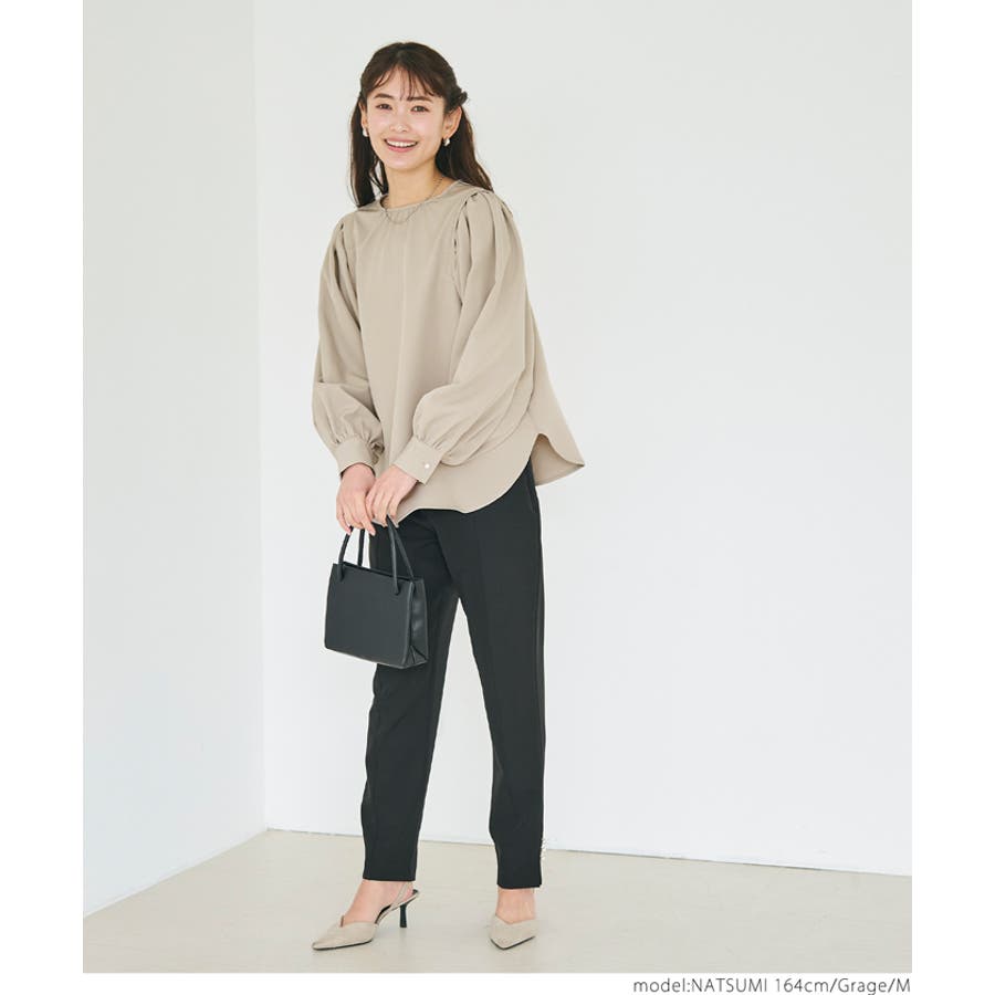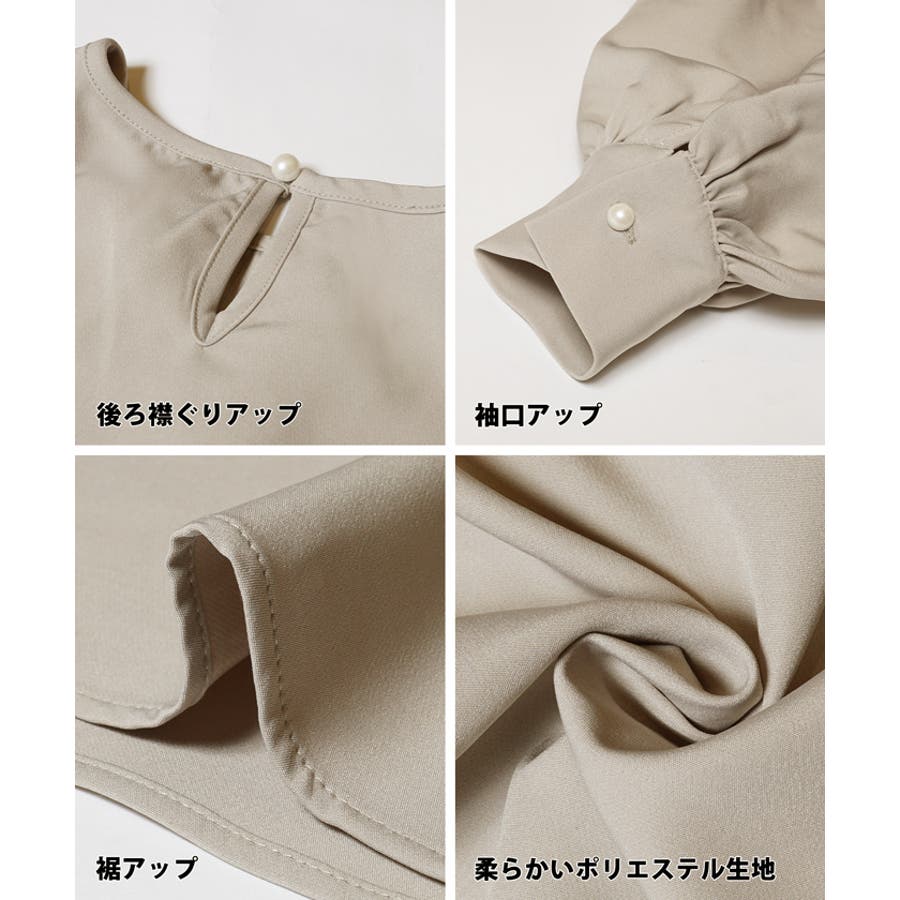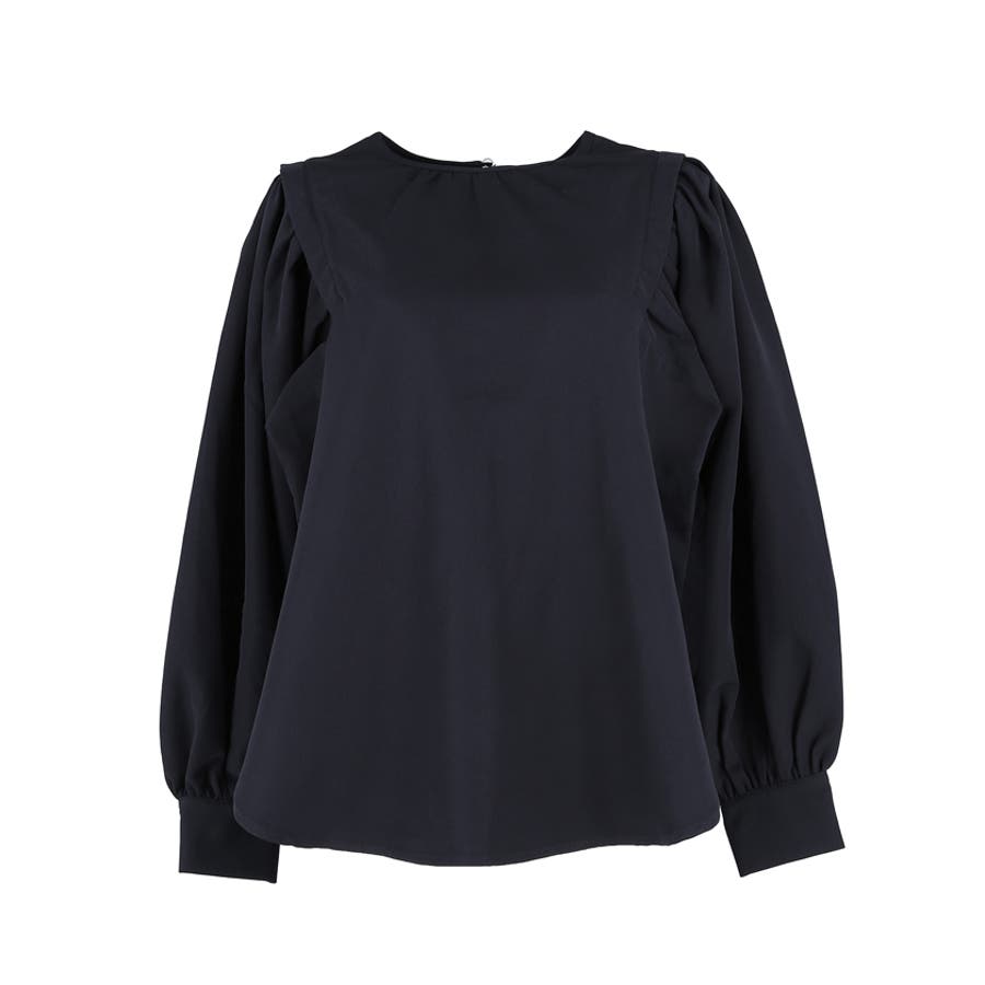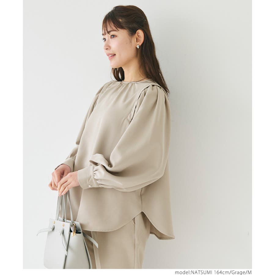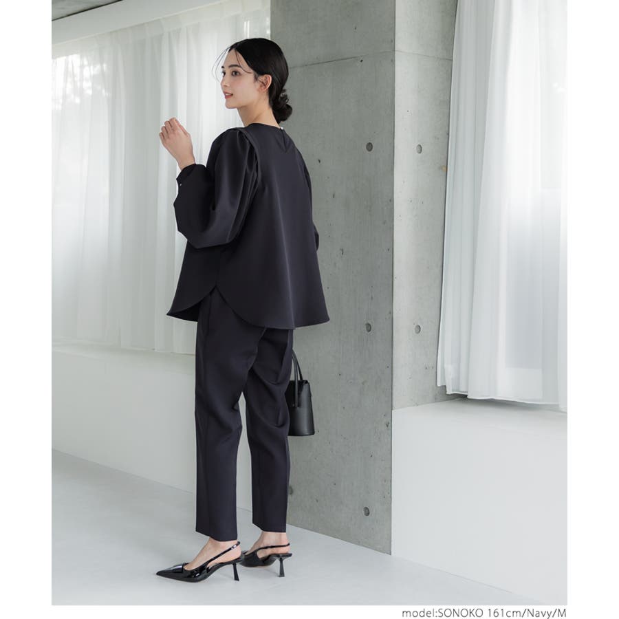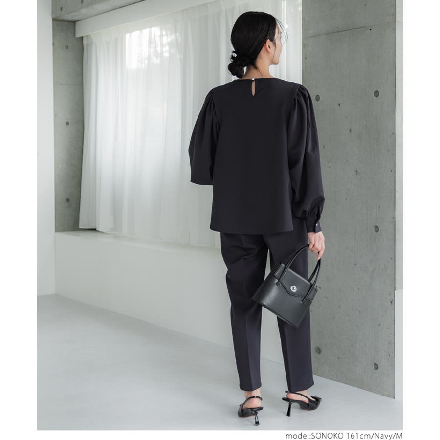 ブラウス レディース セットアップ可能 スーツ ショルダータック テールカット ボリュームスリーブ ラウンドネック 無地 トップス プルオーバー パフスリーブ 丸首 クルーネック パールボタン 涙開き ミディアム丈 長袖 シンプル きれいめ オフィス コカ COCA coca COCA coca