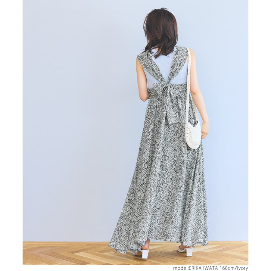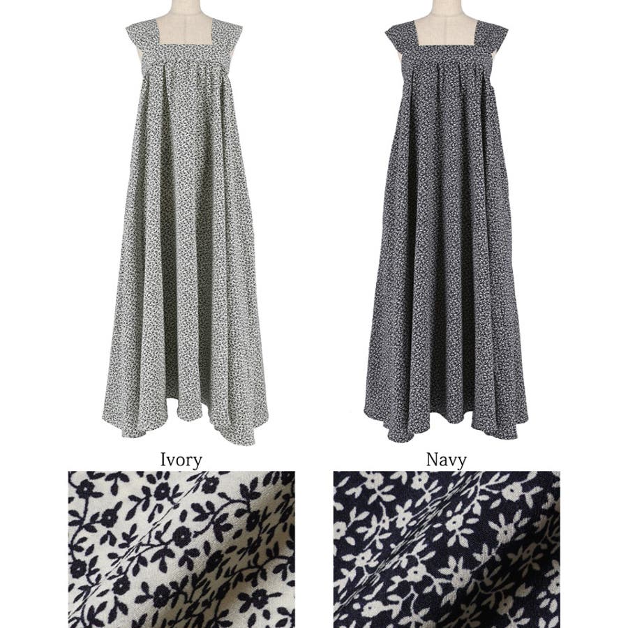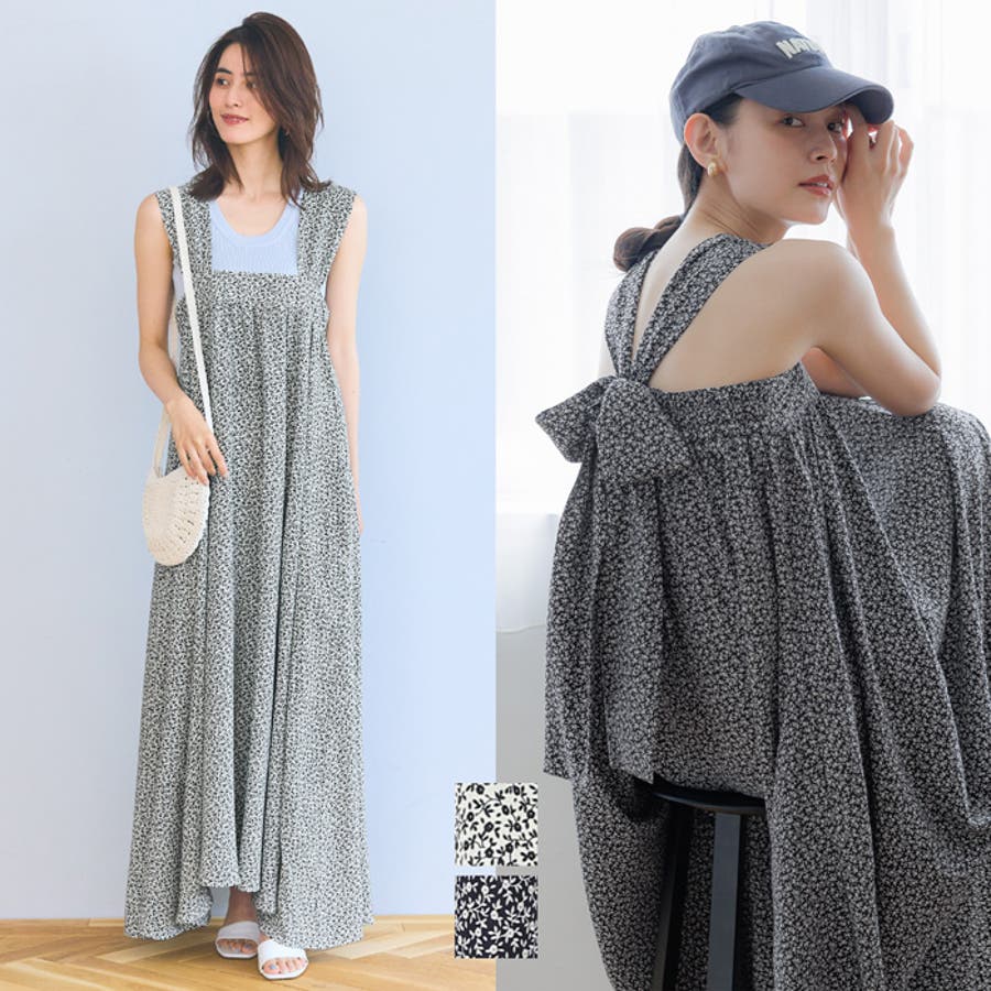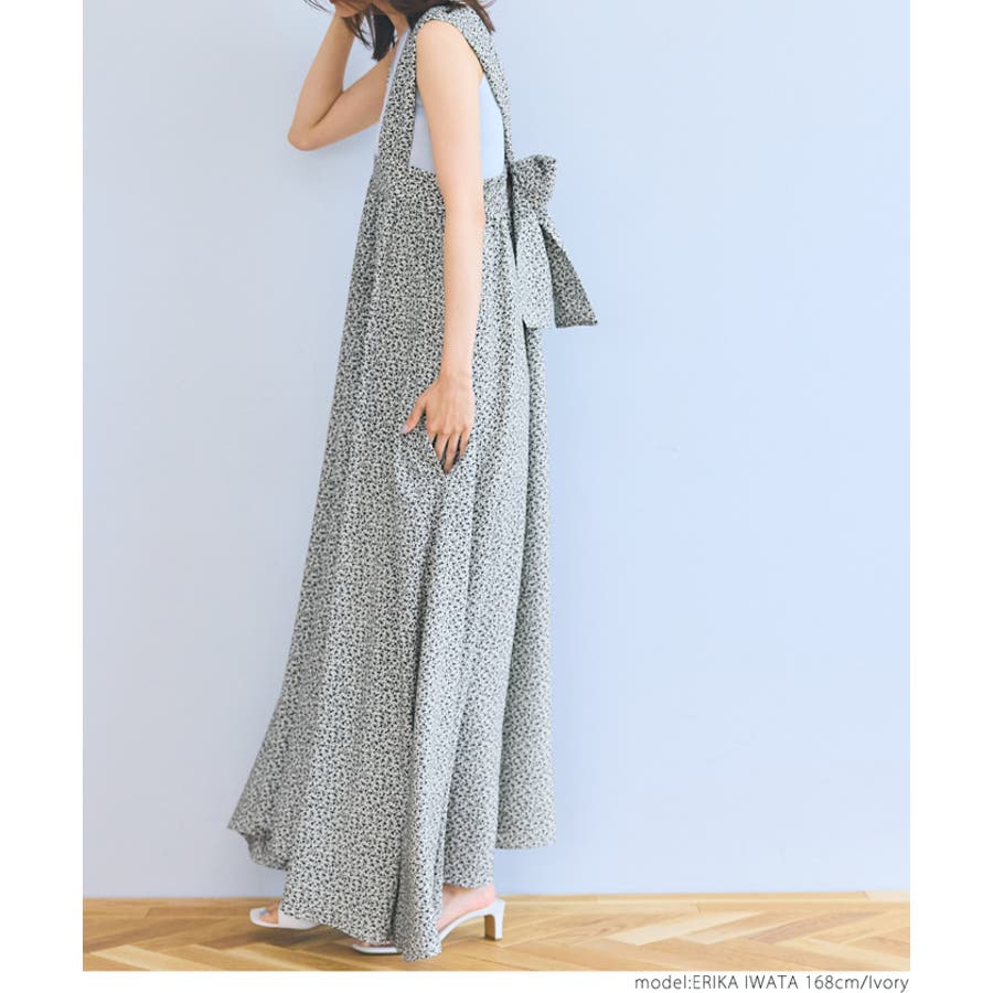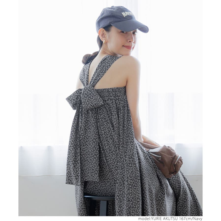 ロングワンピース レディース 小花柄 ヴィンテージ バックリボン 背面ゴム フレア ポケット ボリューム ワンピース ロングワンピ 花柄 後ろリボン ボリュームワンピ フレアワンピ ノースリーブ Aラインシルエット 肩紐調節可 カジュアル コカ COCA coca COCA coca