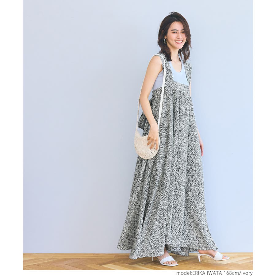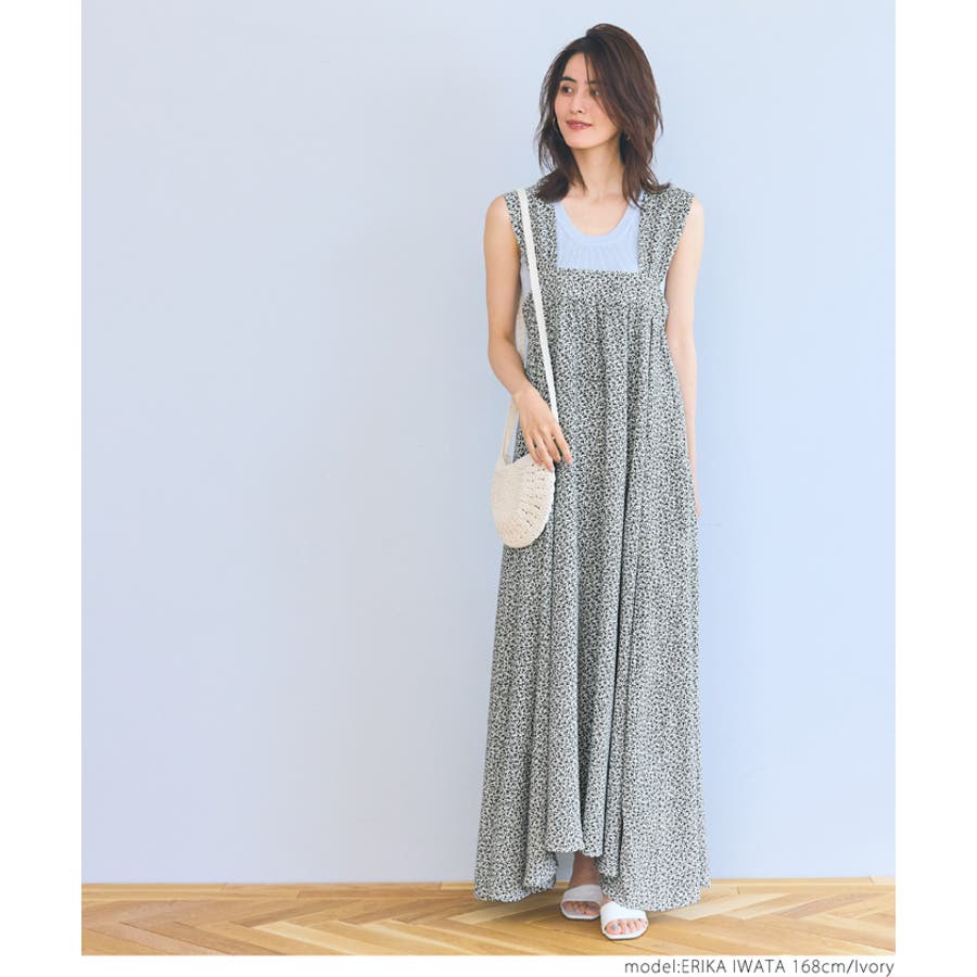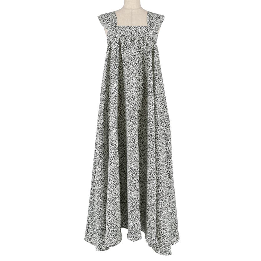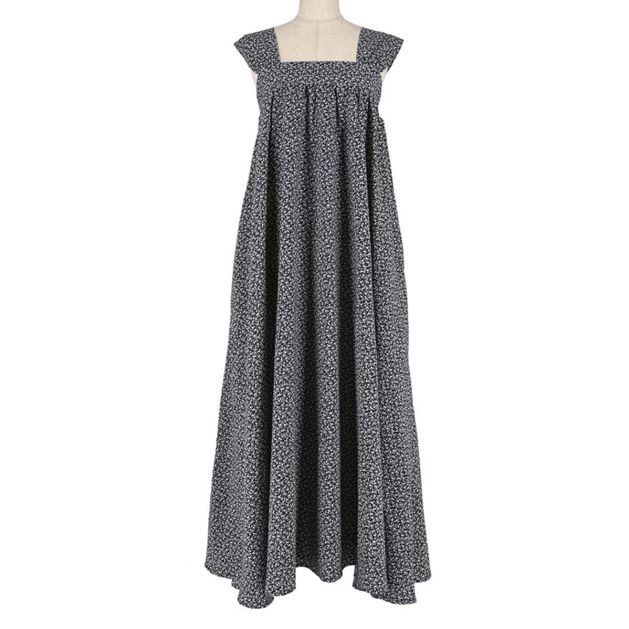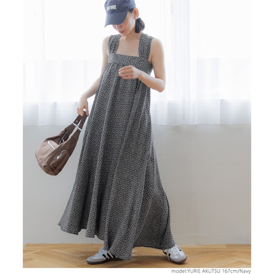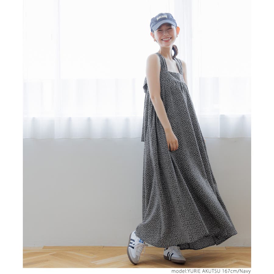 ロングワンピース レディース 小花柄 ヴィンテージ バックリボン 背面ゴム フレア ポケット ボリューム ワンピース ロングワンピ 花柄 後ろリボン ボリュームワンピ フレアワンピ ノースリーブ Aラインシルエット 肩紐調節可 カジュアル コカ COCA coca COCA coca