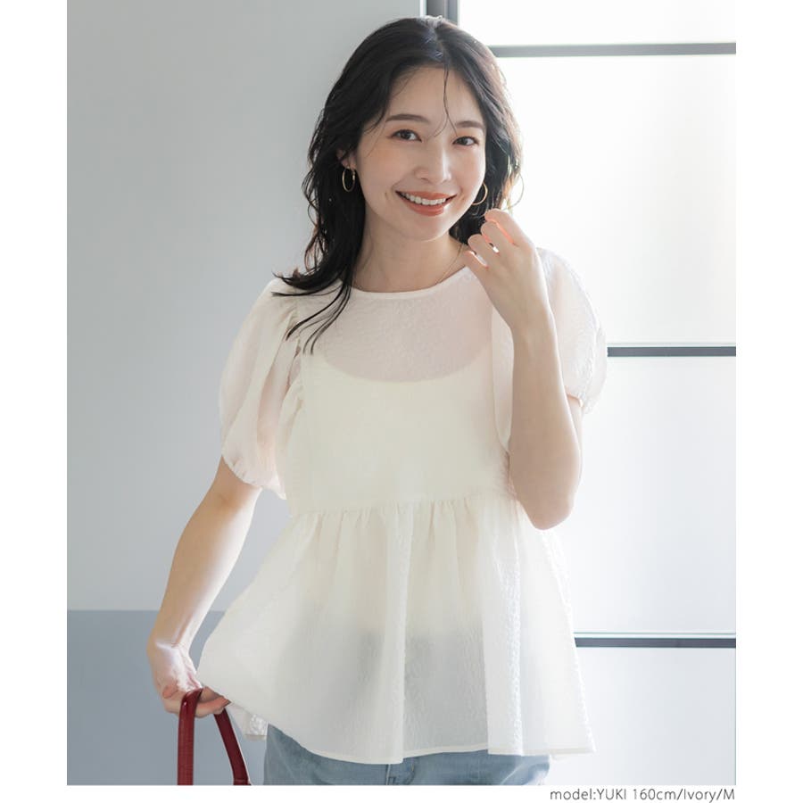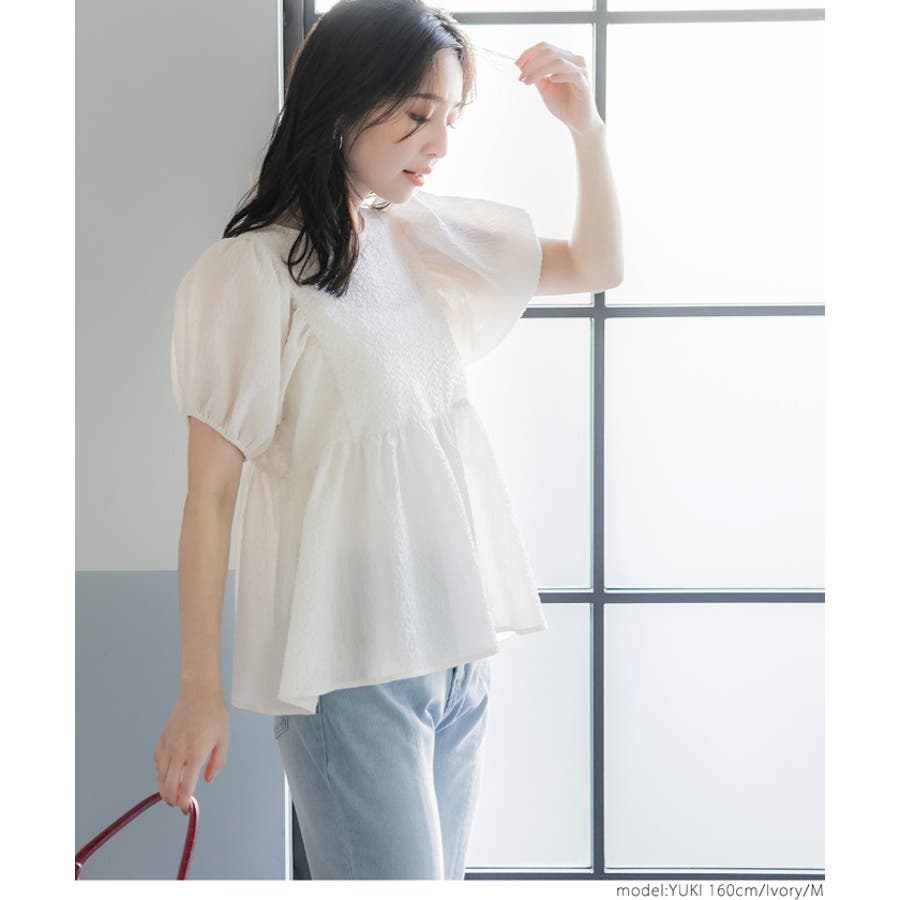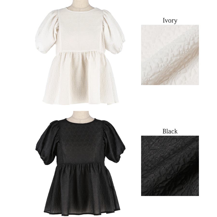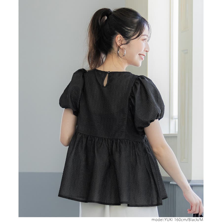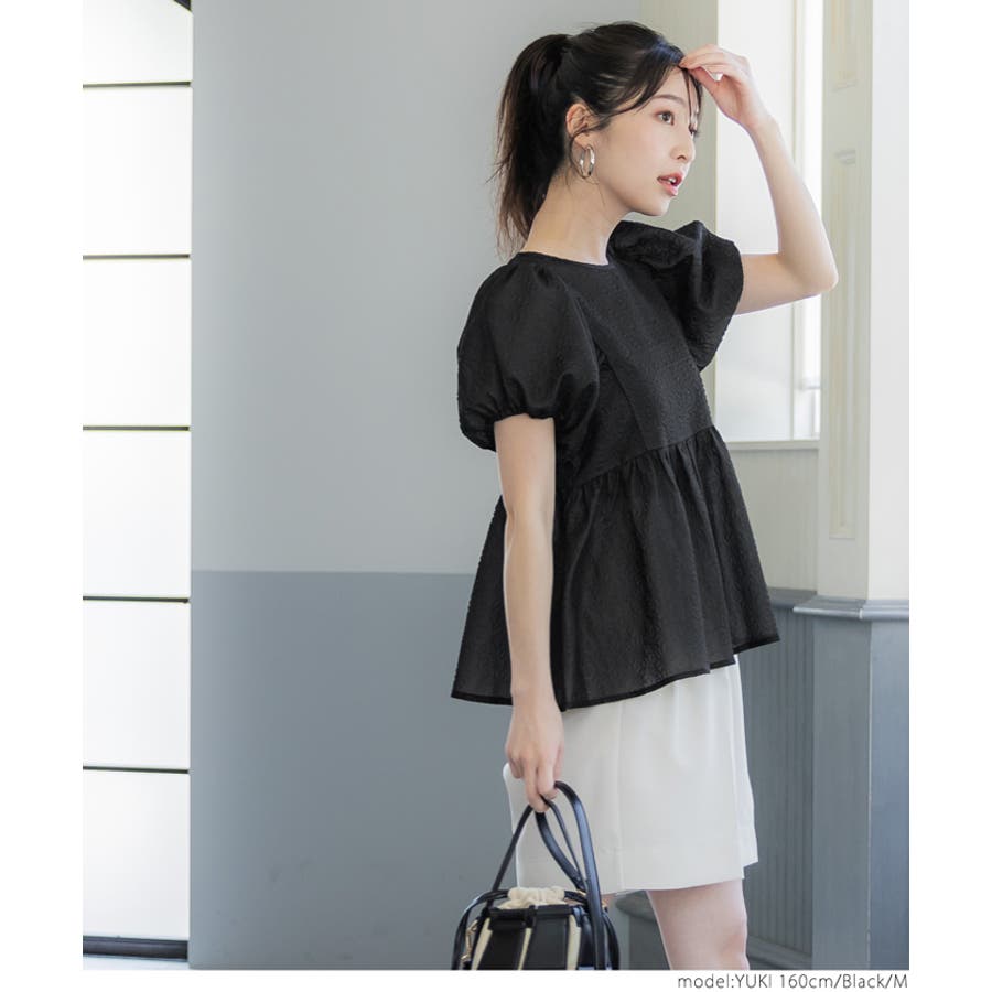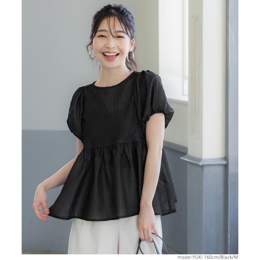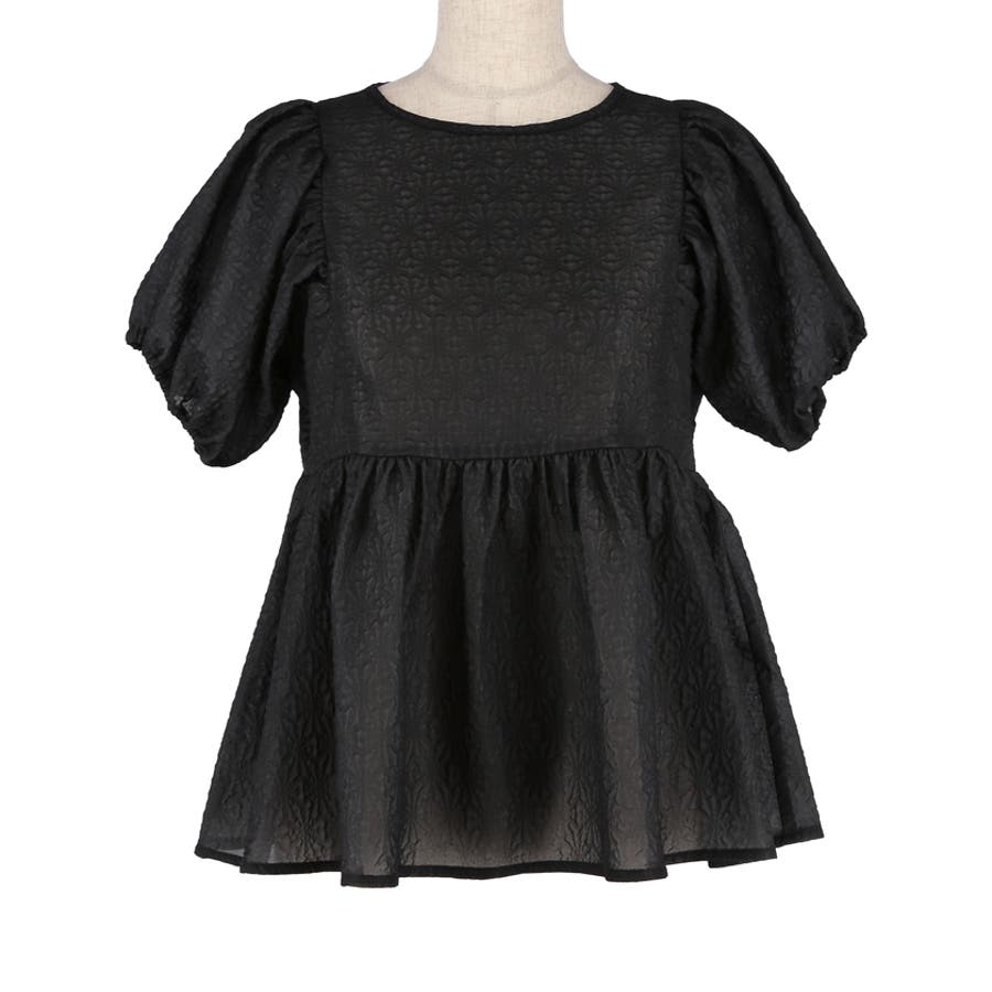ブラウス レディース エンボス シアー ペプラムシルエット バルーンスリーブ 袖口ゴム クルーネック 半袖 無地 上品 トップス プルオーバー シアーブラウス エンボス加工 透け感 涙開き フレアシルエット ボリューム袖 ラウンドネック きれいめ シンプル コカ COCA coca COCA coca