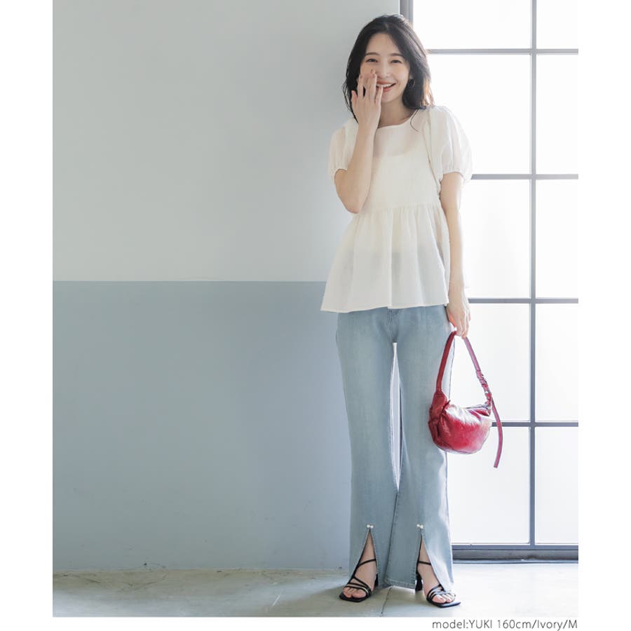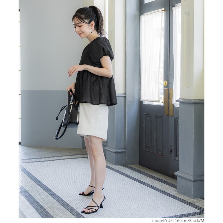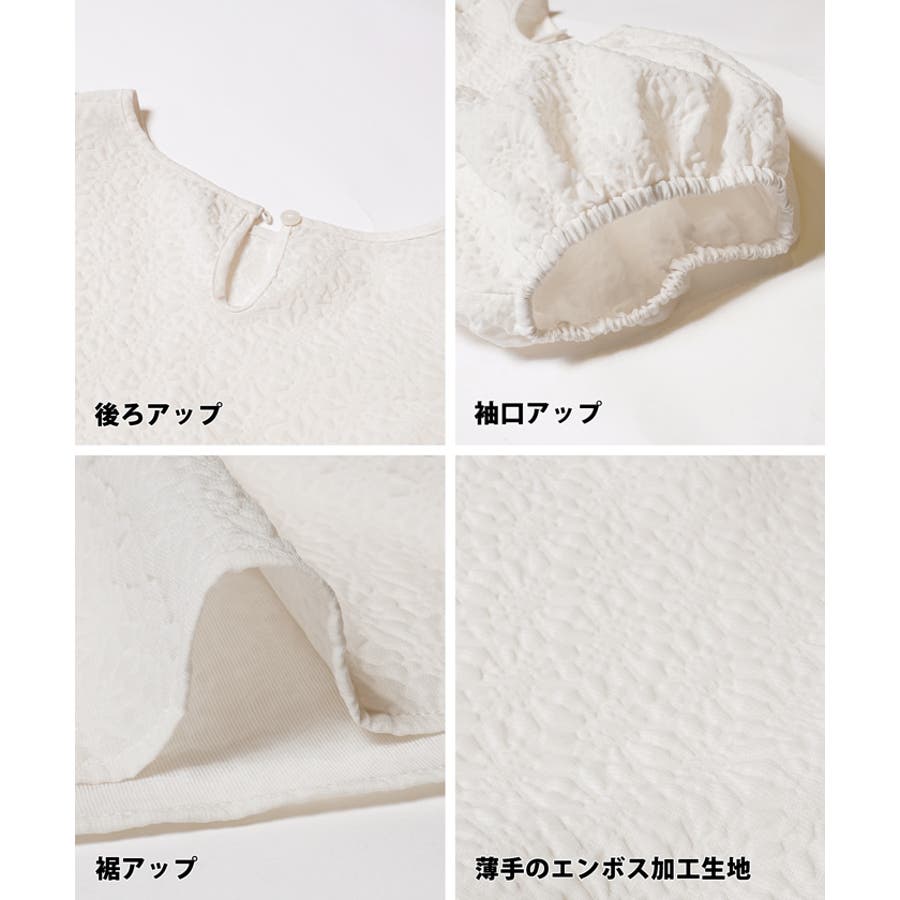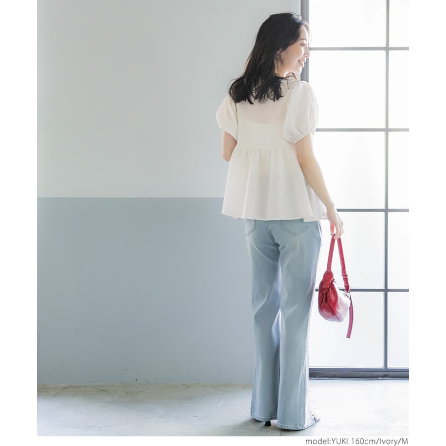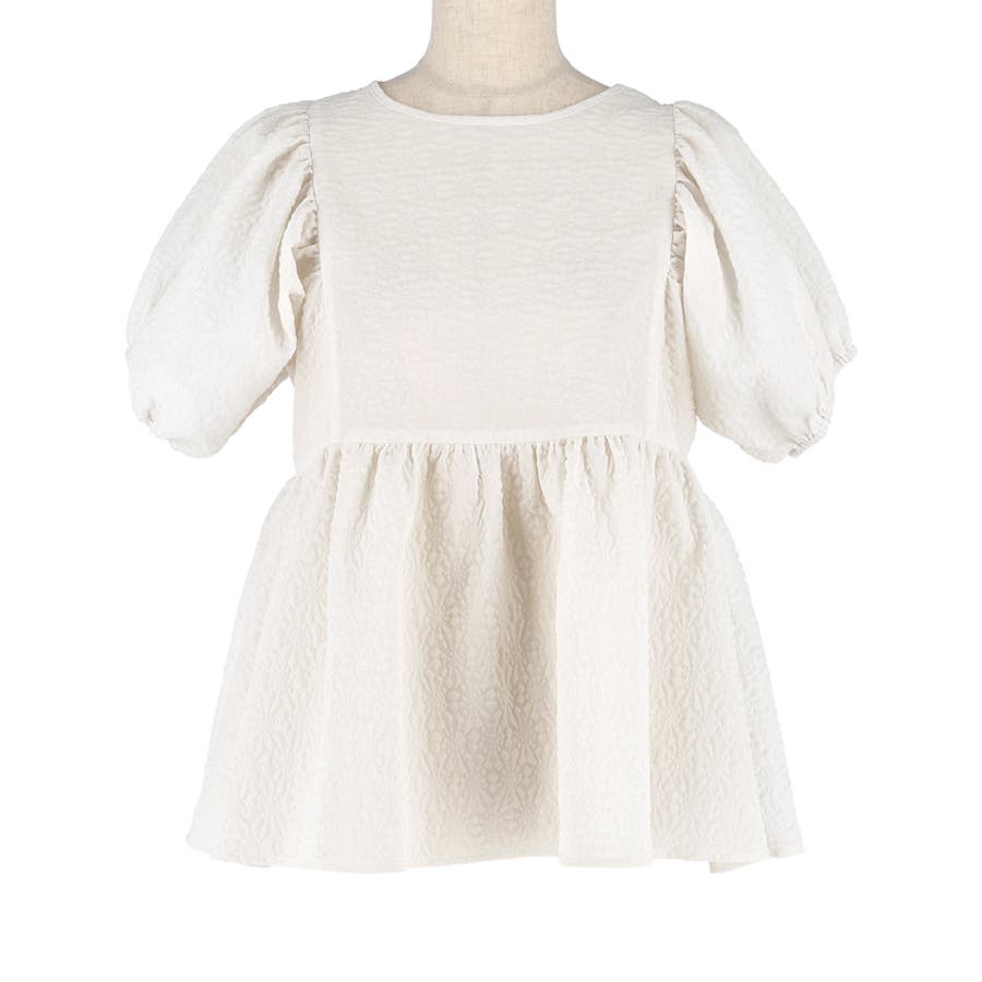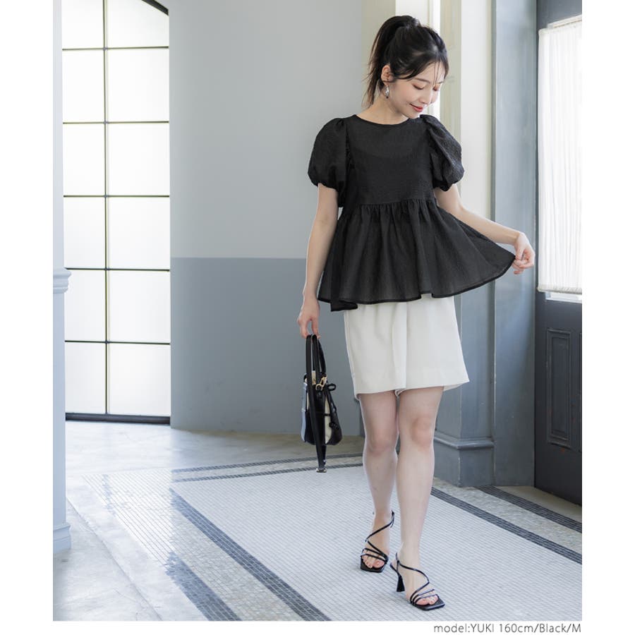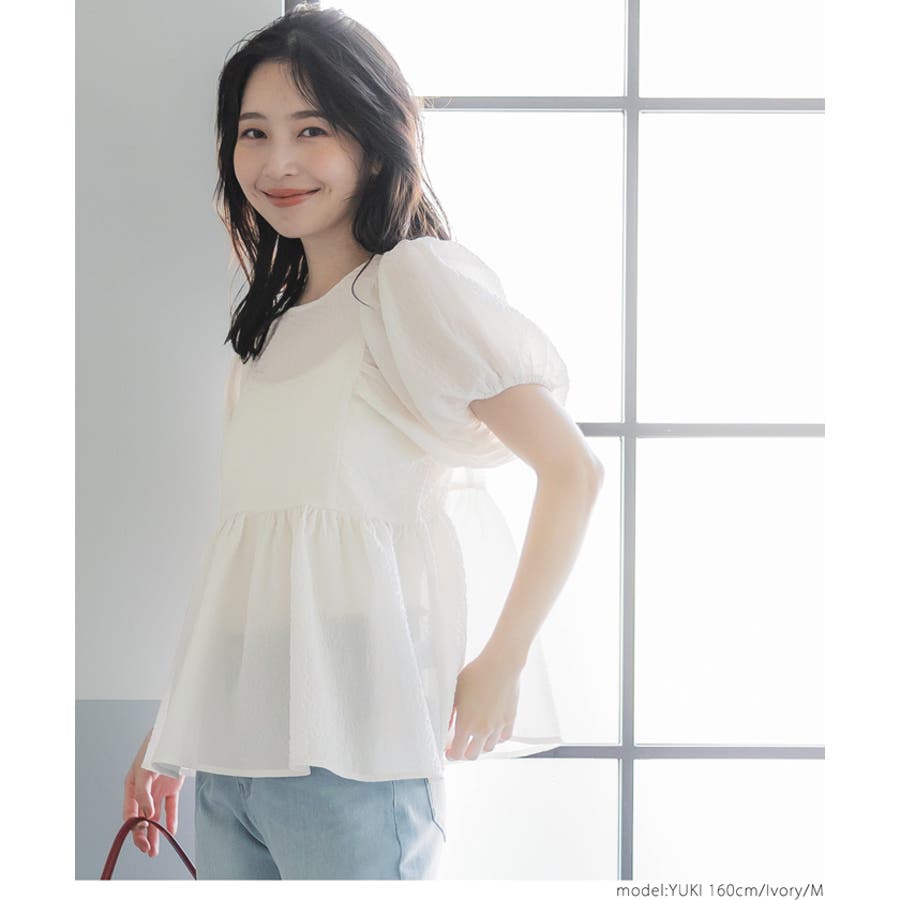ブラウス レディース エンボス シアー ペプラムシルエット バルーンスリーブ 袖口ゴム クルーネック 半袖 無地 上品 トップス プルオーバー シアーブラウス エンボス加工 透け感 涙開き フレアシルエット ボリューム袖 ラウンドネック きれいめ シンプル コカ COCA coca COCA coca