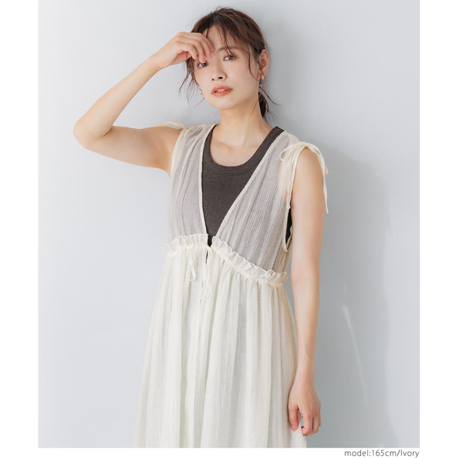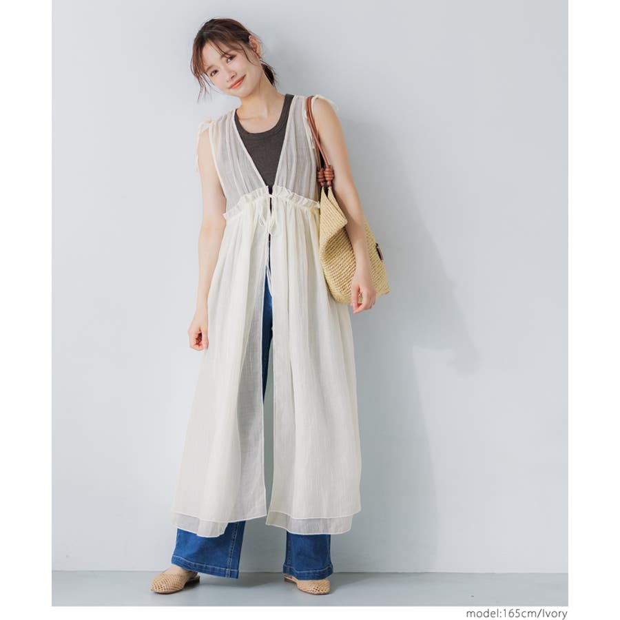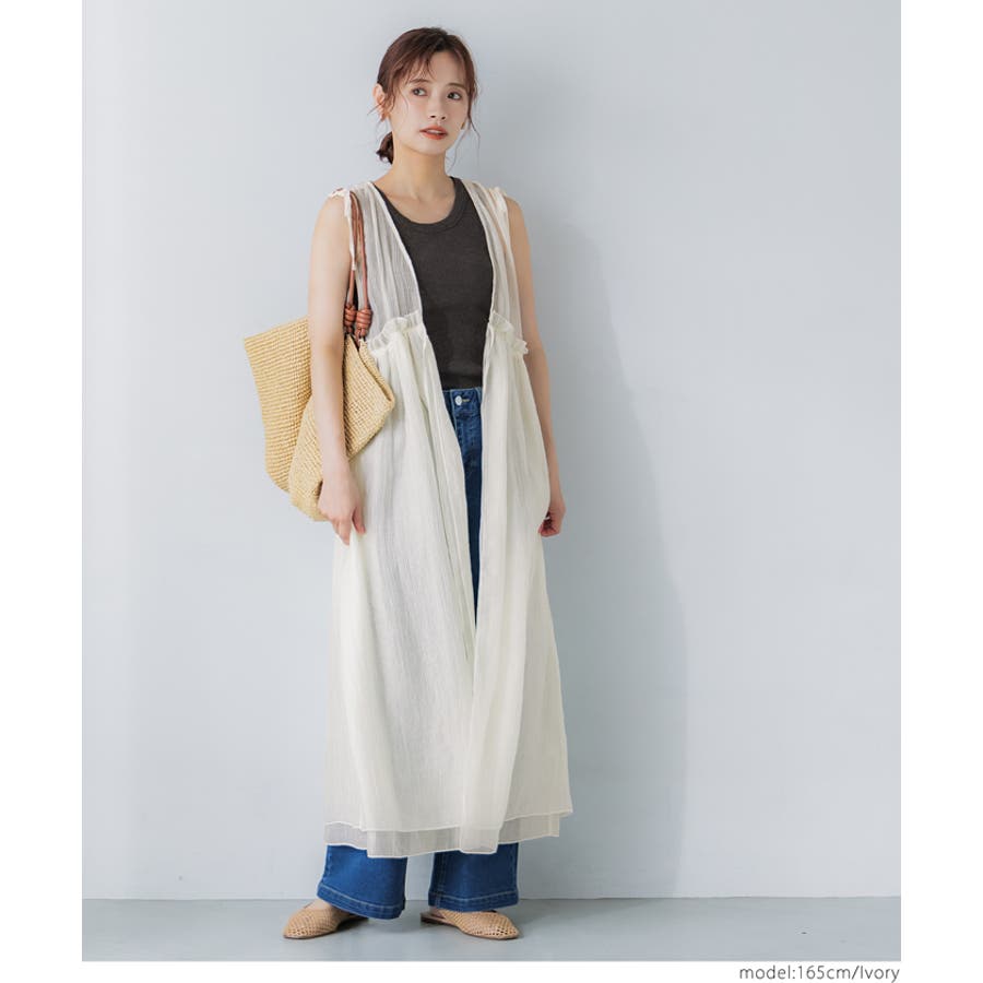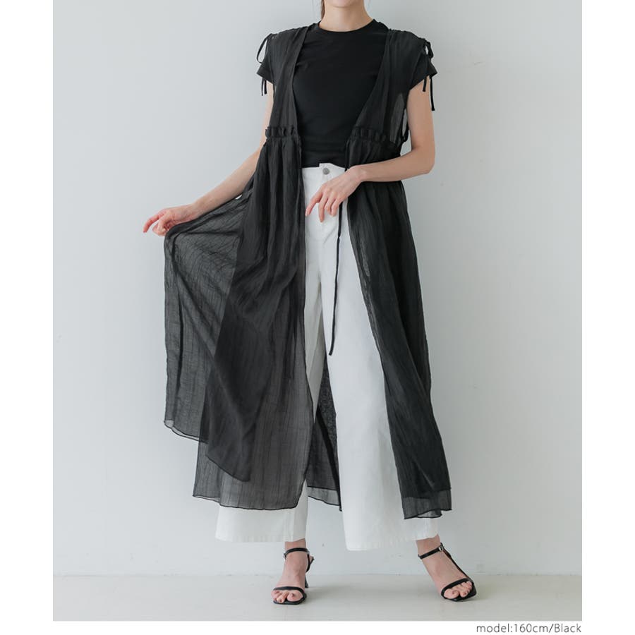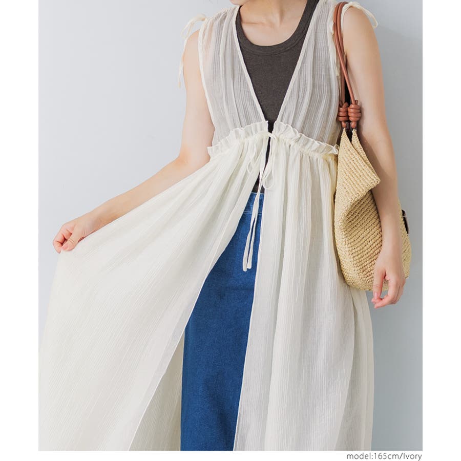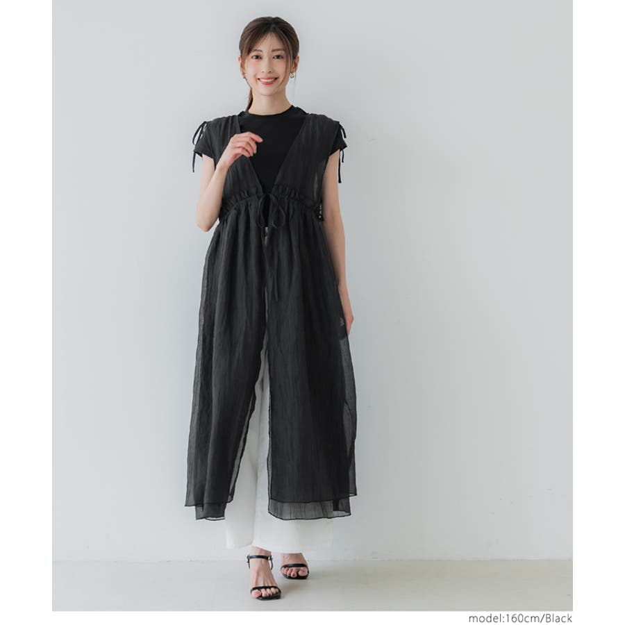 ワンピース ジレ 前開き 重ね着 透け感 シアー ギャザー ノースリーブ リボン紐 羽織り カジュアル ロング丈 25ss コカ COCA coca COCA coca おしゃれ 可愛い きれいめ おとな 大人 女性ファッション 体系カバー 韓国 夏服 夏 カジュアル プチプラ 10代 20代 30代 40代 50代 オフィス シンプル