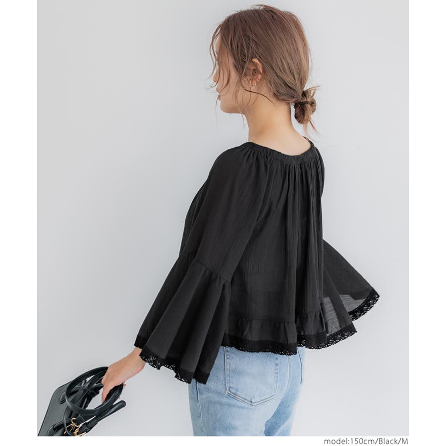 甘さを引き立てるレース素材に、ふんわりと広がるフレアスリーブが女性らしさをプラス。