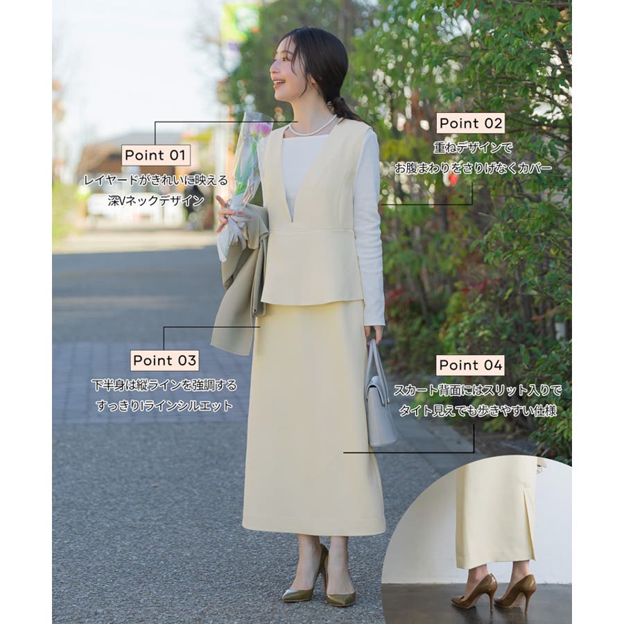 ・スカート部分は動きのある異素材で軽やかさをプラス