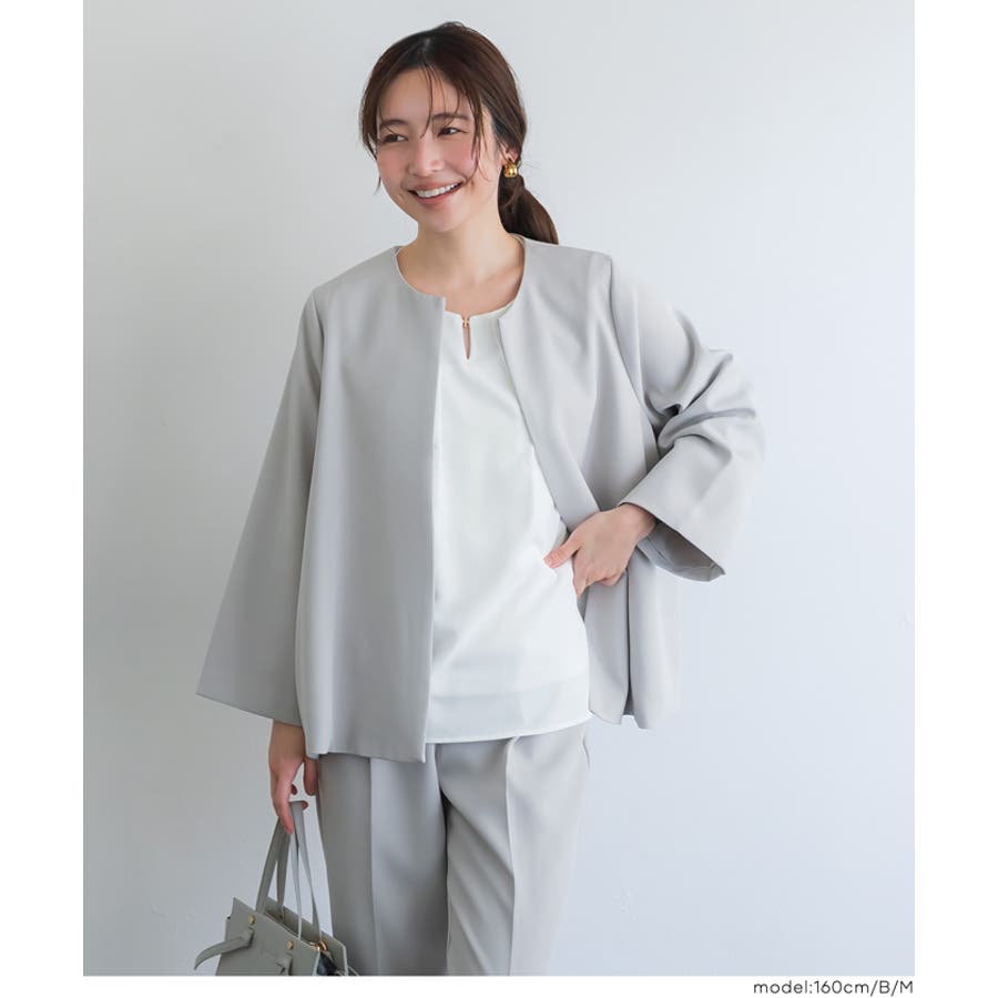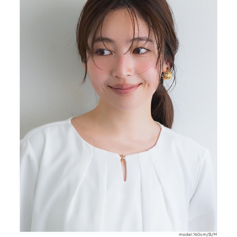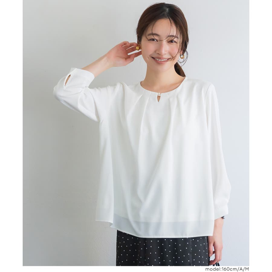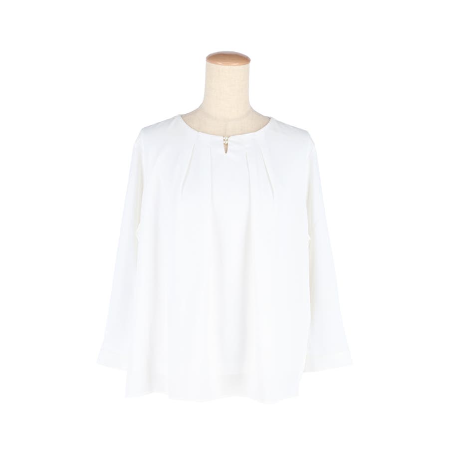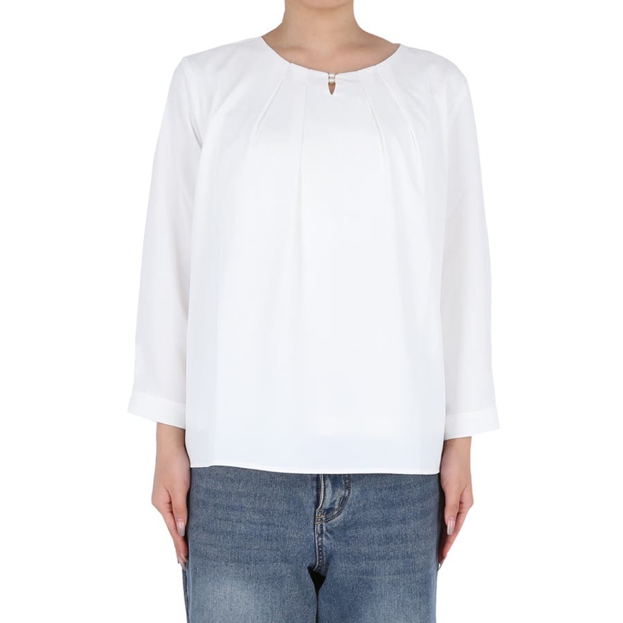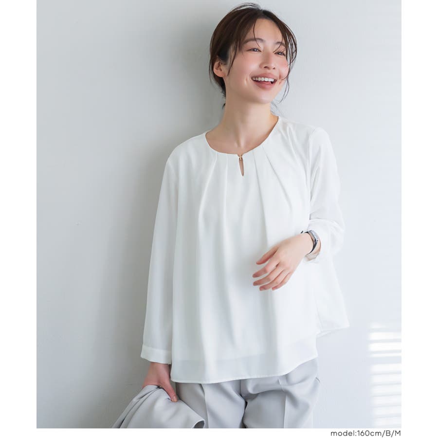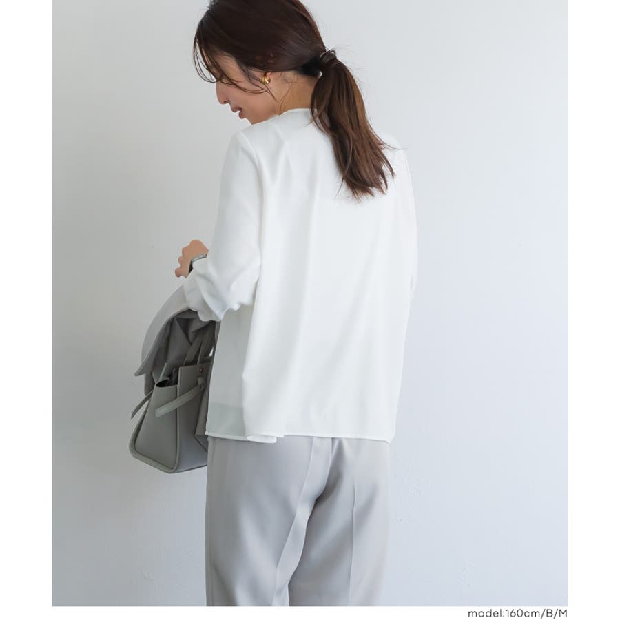 首元をすっきり見せてくれるノーカラーデザインのブラウス。