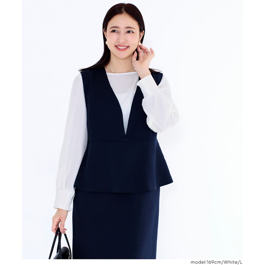 首元をすっきり見せるノーカラーデザインで、上品な印象に