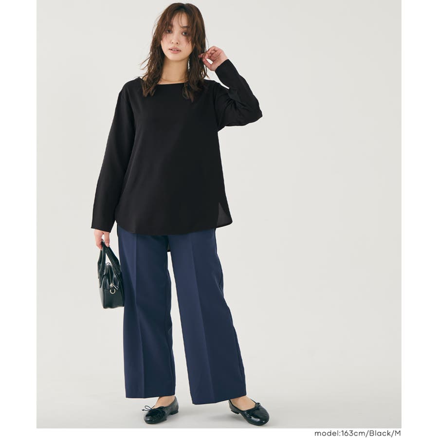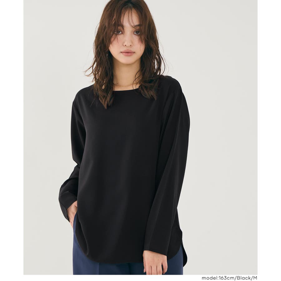 体のラインを拾いにくい適度なゆとりと、レイヤードしやすい丈感で、インナーにも一枚着にも使いやすいデザインです。