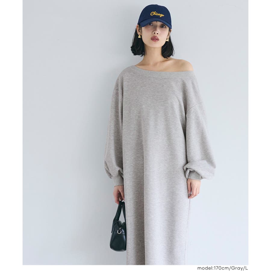 オフショルダーとしても、通常のネックラインとしても着用できる2WAY仕様の裏毛ワンピース。