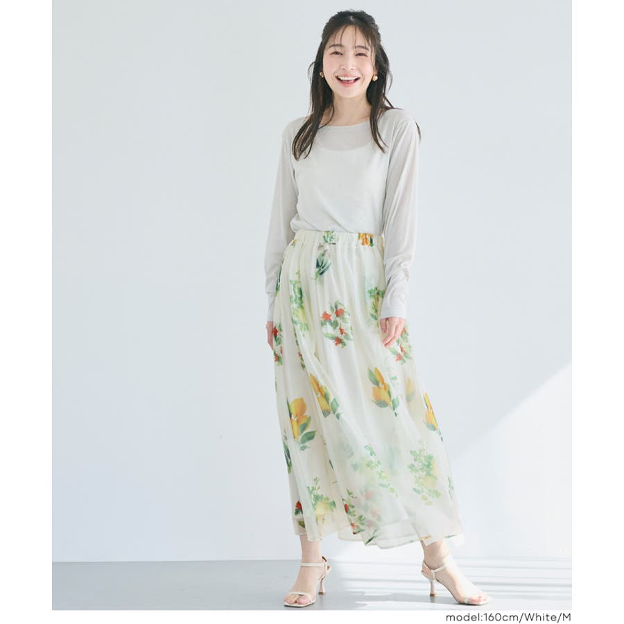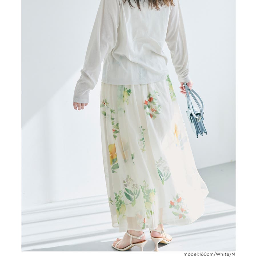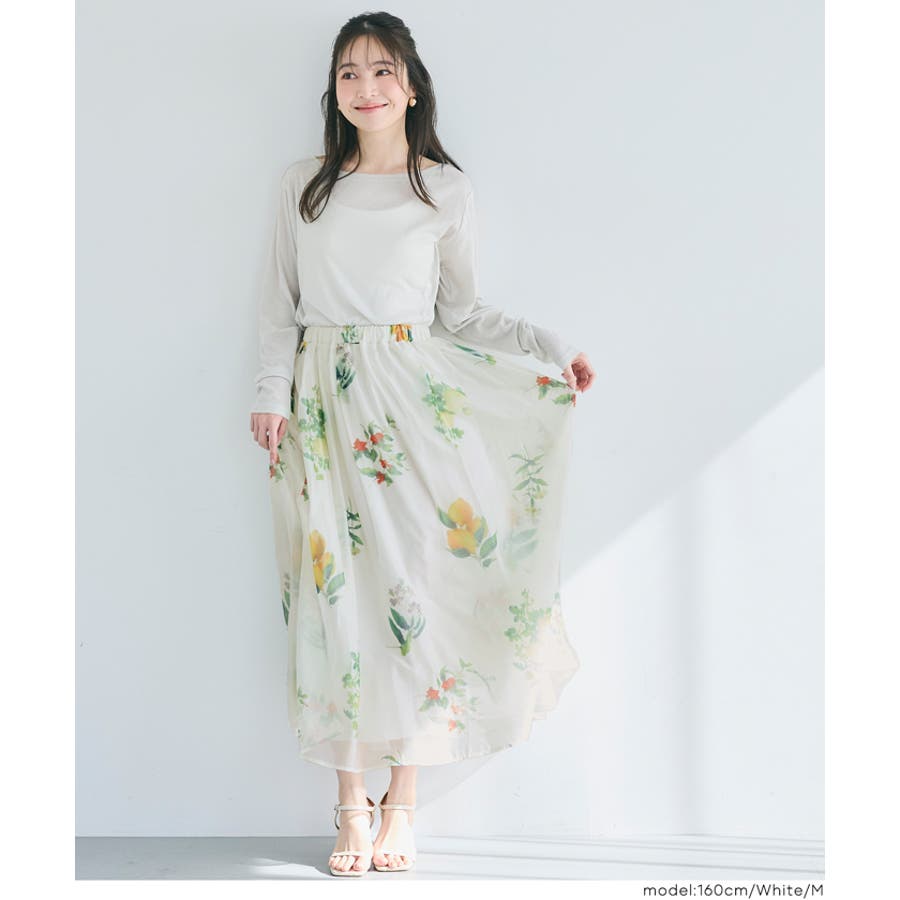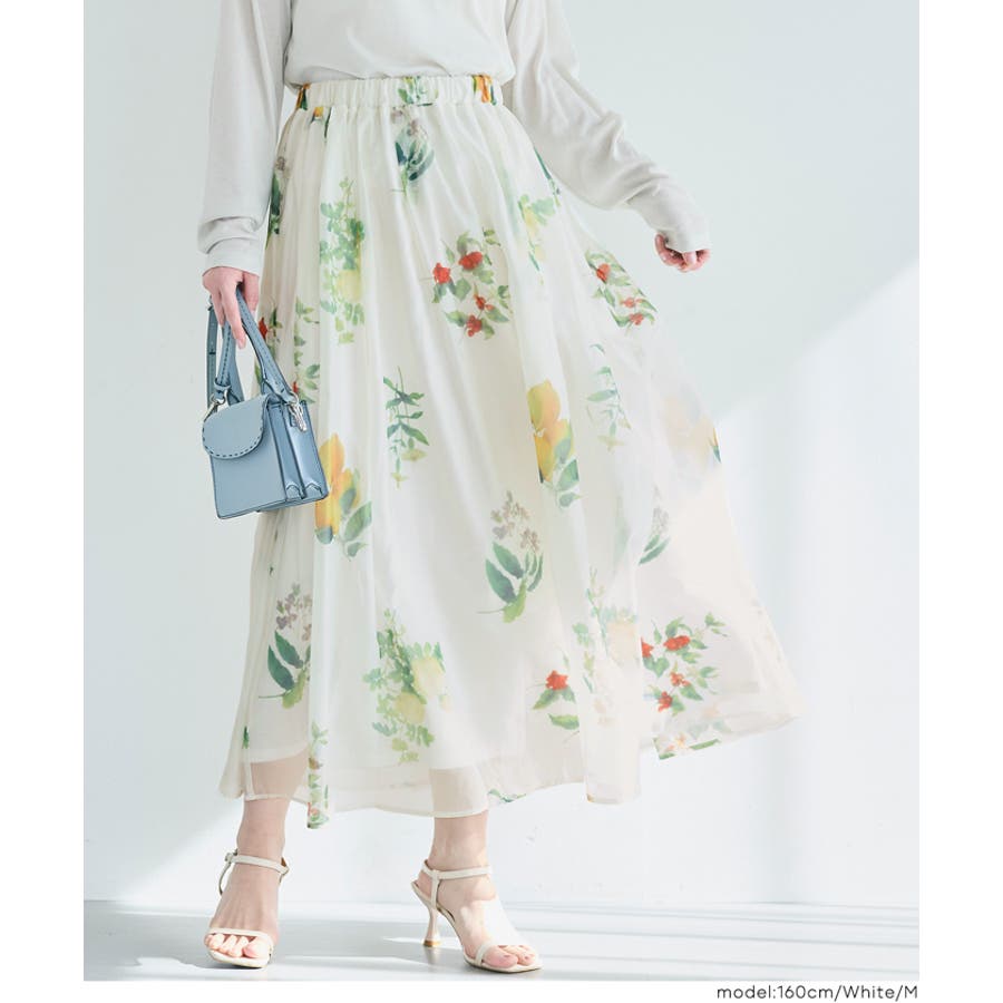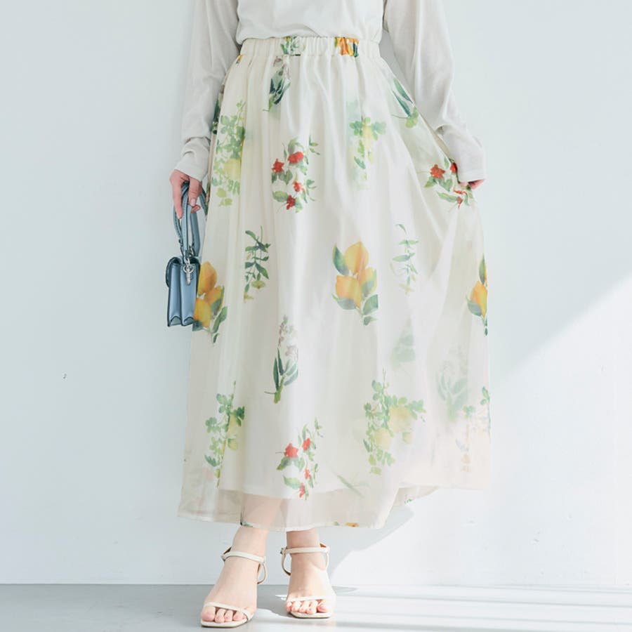 軽やかなオーガンジー素材に、繊細なフラワープリントをのせたフレアスカート。