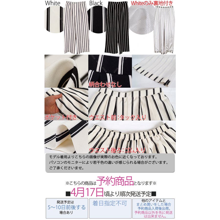 注意点:WHITEのみ裏地付き、ポケット付き、背面ウエストゴム、柄合わせなし