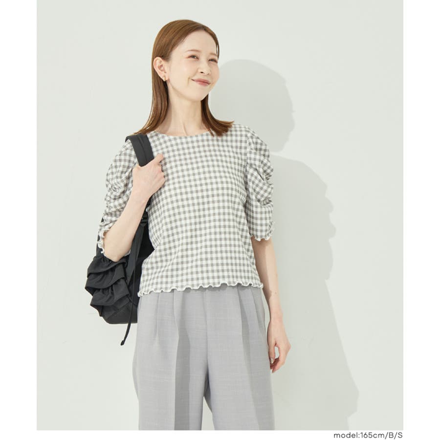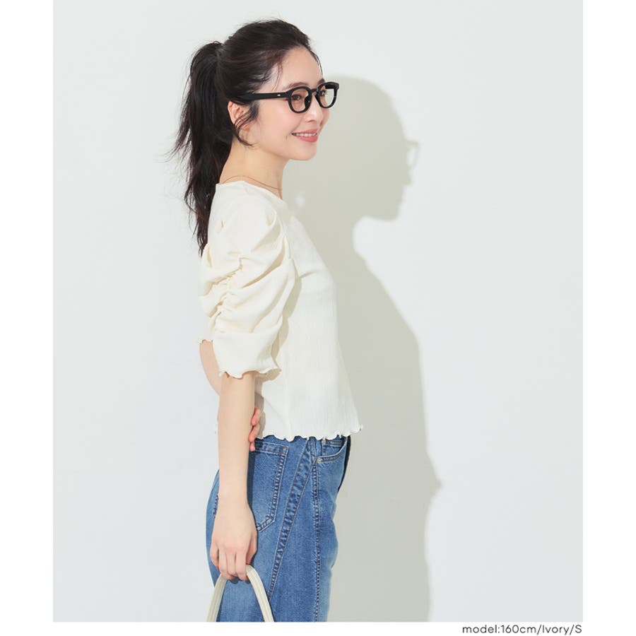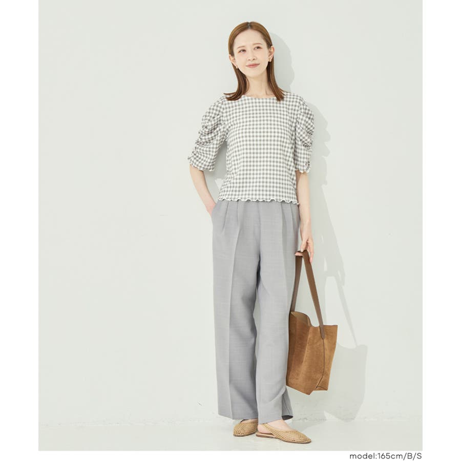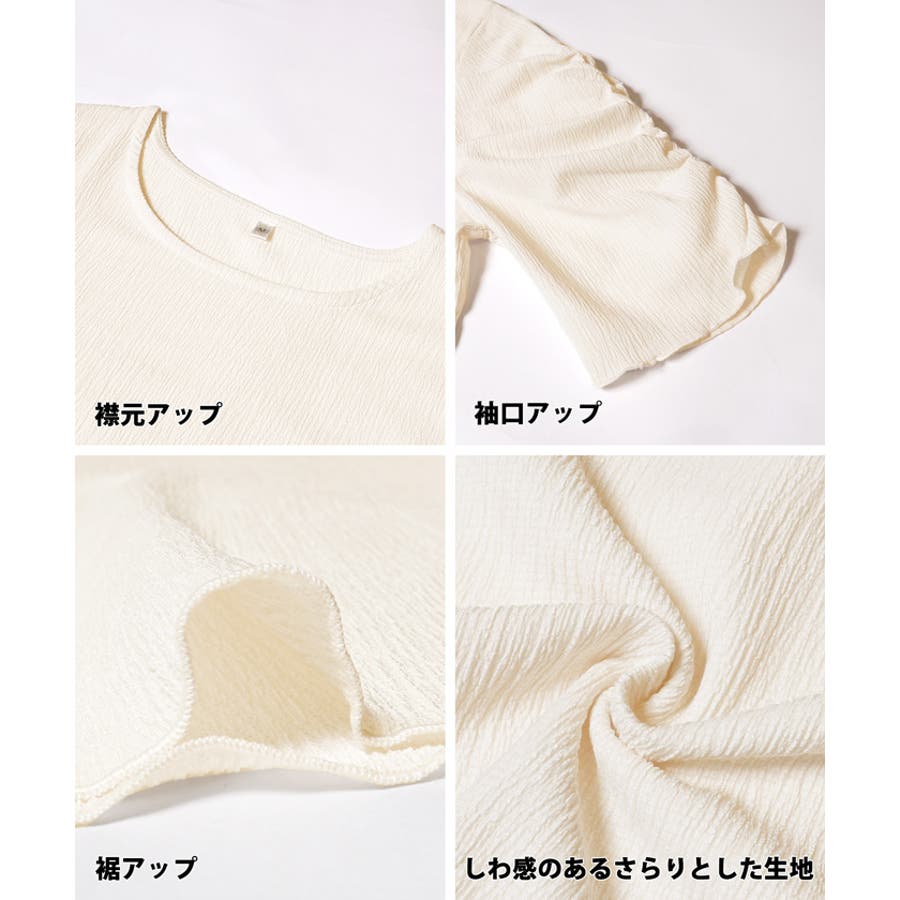 ギャザーを寄せ立体的に仕上げた5分袖のデザインスリーブが、気になる二の腕周りをさりげなくカバーしてくれます。