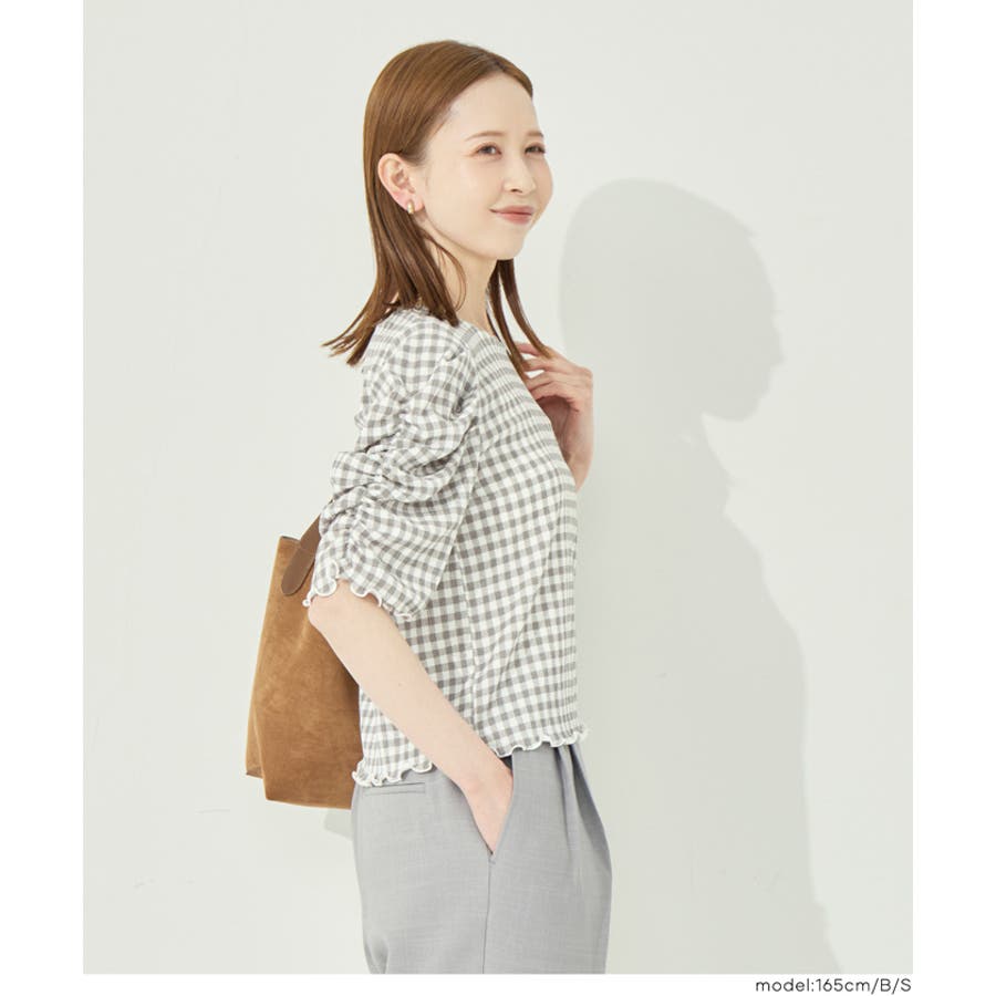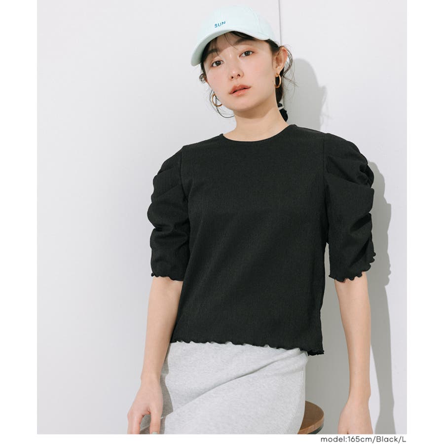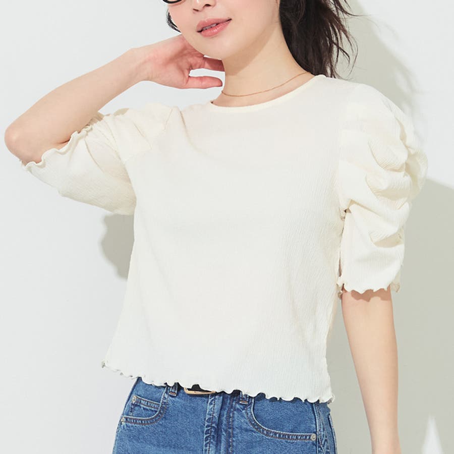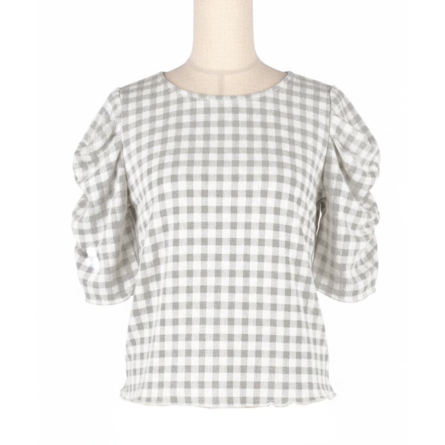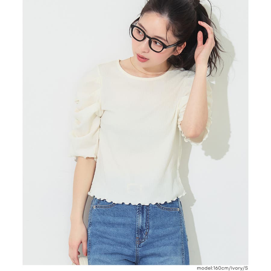 ギャザーを寄せ立体的に仕上げた5分袖のデザインスリーブが、気になる二の腕周りをさりげなくカバーしてくれます。